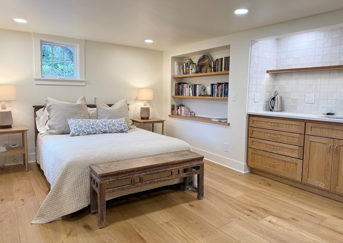 Bedroom: All sheets, pillows, mattress are brand new. The bed frame is handmade by a local craftsman. Stylish kitchenette with fridge, microwave, coffee and tea supplies. Hot plate and cookware available for cooking if needed. Mugs, silverware, plates, bowls are all available.
