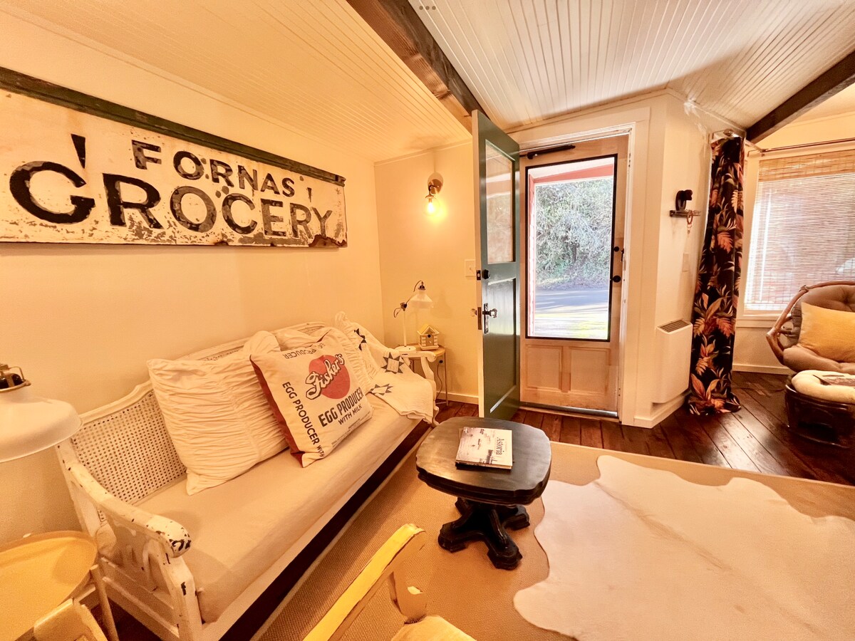Once Astoria’s first garage, this charming space has been transformed into a unique and inviting retreat. Walled off from the main house, it offers privacy and character, featuring reclaimed wood trim, Thai teak floors, and tall ceilings that create a sense of volume in its tiny-house-style layout. The windows provide views of the historic Fisher House, a stunning Italianate Victorian completed in the early 1880s.