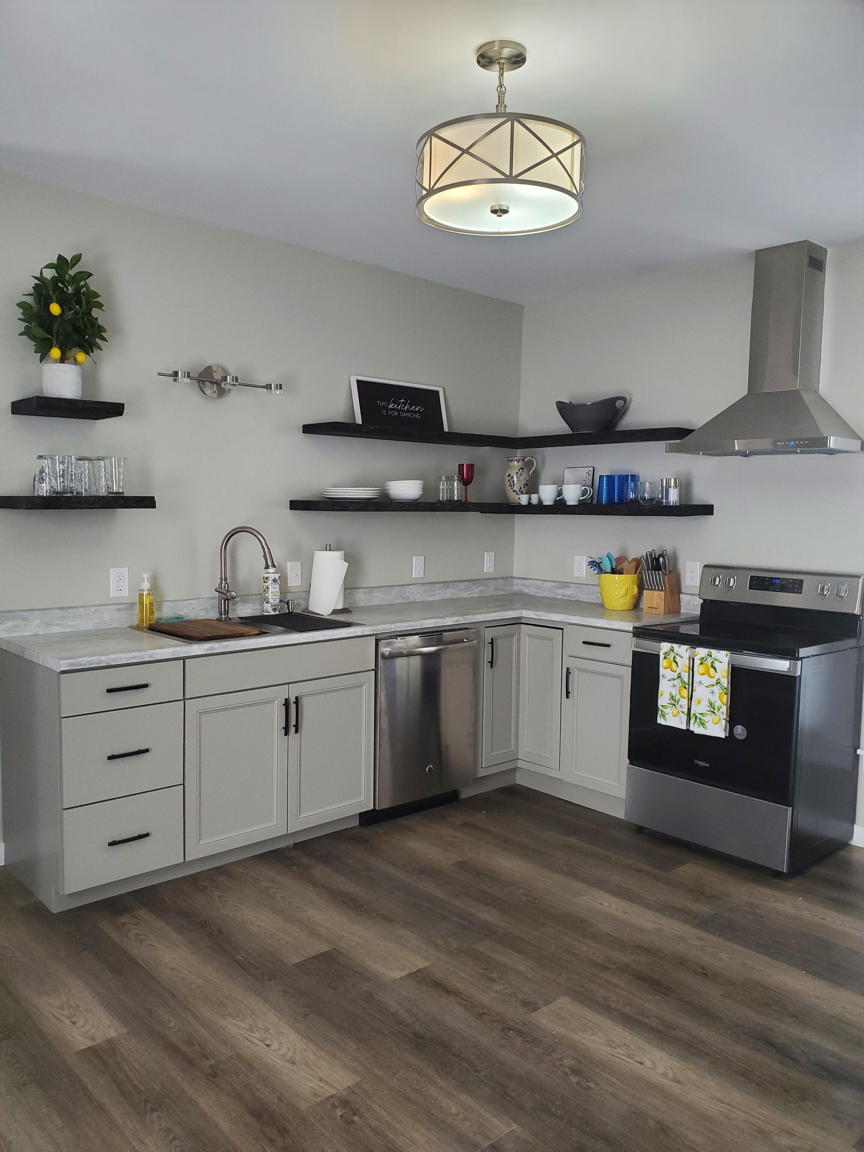 There is a full kitchen with table and washer/dryer. (bring your own detergent)