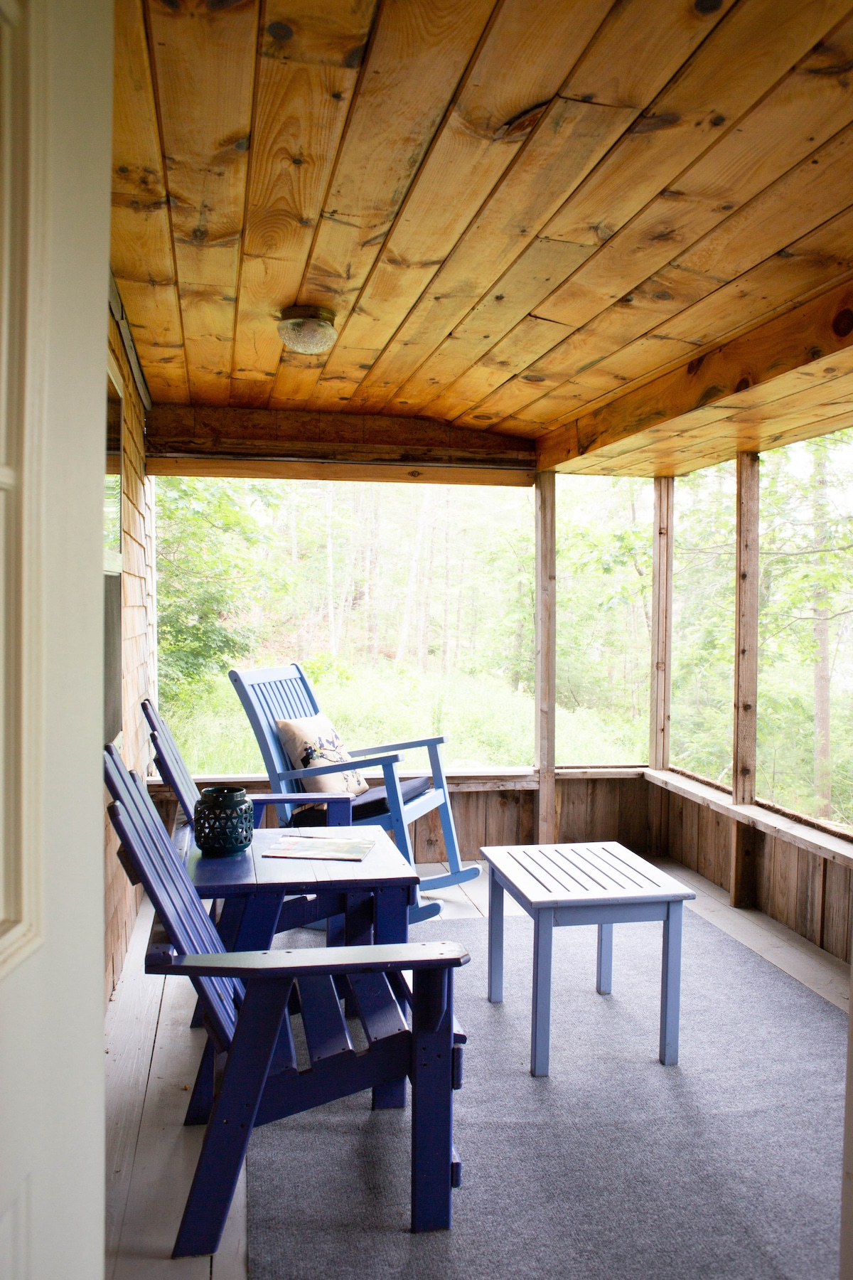 In the summer, you can move outside to the porch, which is furnished with sofas, chairs, and tables of its own. It's also fully screened-in, so you don't need to worry about mosquitos or other pesky insects crashing the party. There's even a hammock out in the trees for those lazy afternoons.