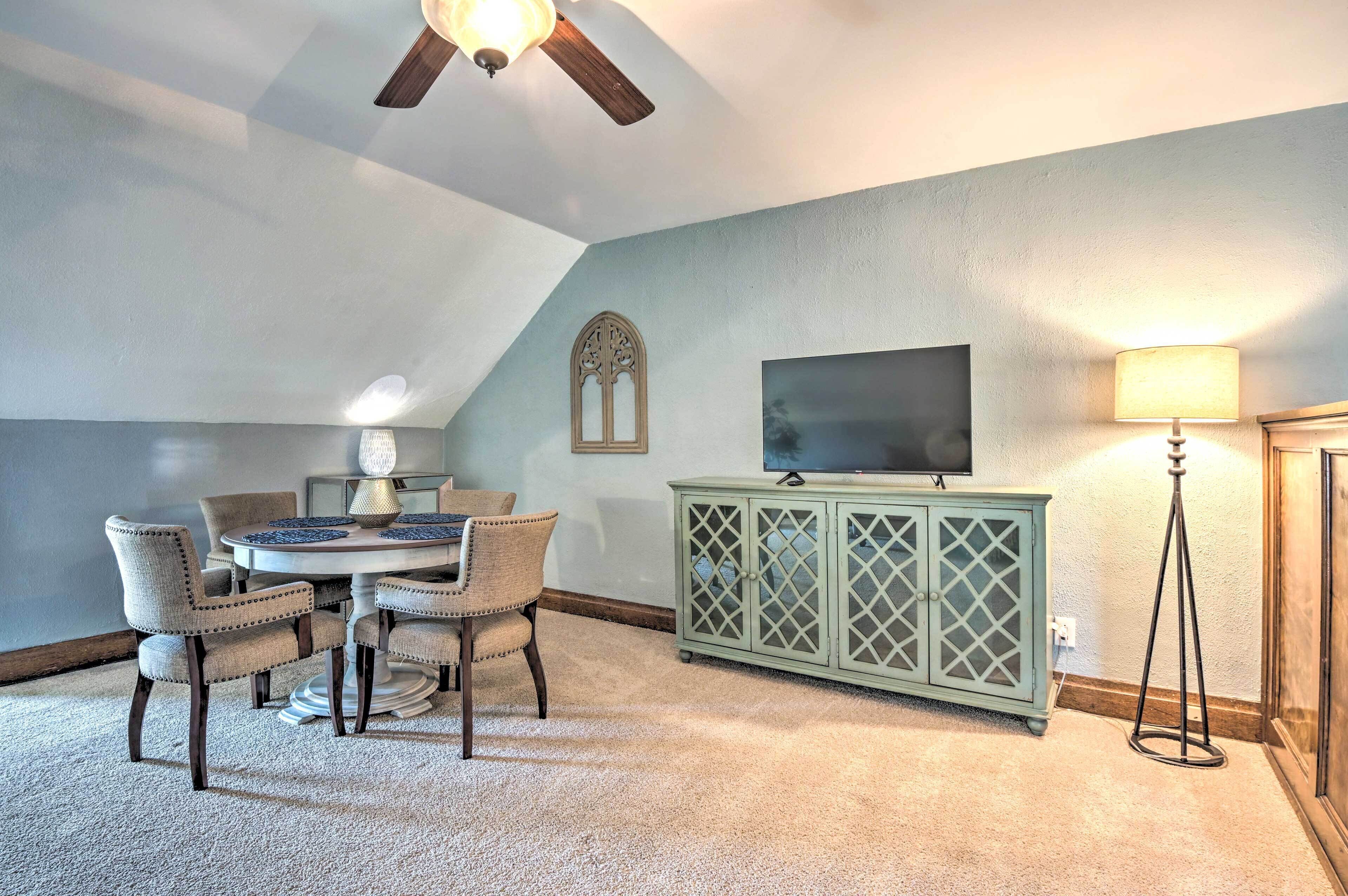 INDOOR LIVING: Smart TV, 2 fireplaces (decorative), dining table, shower/tub combo, ceiling fans