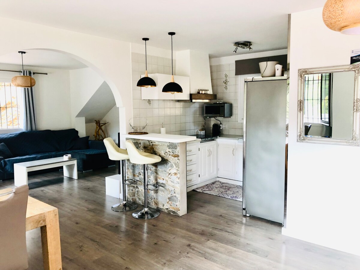 4-room house 101 m2 on 2 levels. Simple and rustic furnishings: living/dining room 23 m2, on 2 levels with open-hearth fireplace, digital TV, DVD, electric heater and boiler (50 litres). Exit to the terrace. 1 room 7 m2 with 1 bed (90 cm). Kitchen (4 hot plates, oven, toaster, kettle, electric coffee machine). Upper floor: 1 room 12 m2 with 1 double bed (2 x 80 cm), electric heater. 1 room 9 m2 with 2 beds (90 cm), electric heater. Bath/WC. Terrace 12 m2 partly roofed. Terrace furniture, barbecue (portable). Facilities: washing machine, iron. Internet (DSL/LAN, free). Reserved parking (fenced). Please note: maximum 1 pet/ dog allowed. TV only ES. Additional services to be paid for on site: Pets 30 Euros/stay.