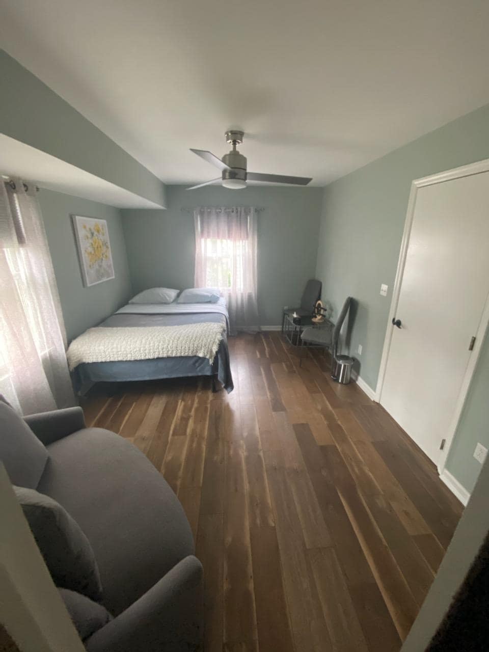 - Bedroom with queen size bed, Smart TV, tower fan, individual mini-split air conditioner and heater with temperature control