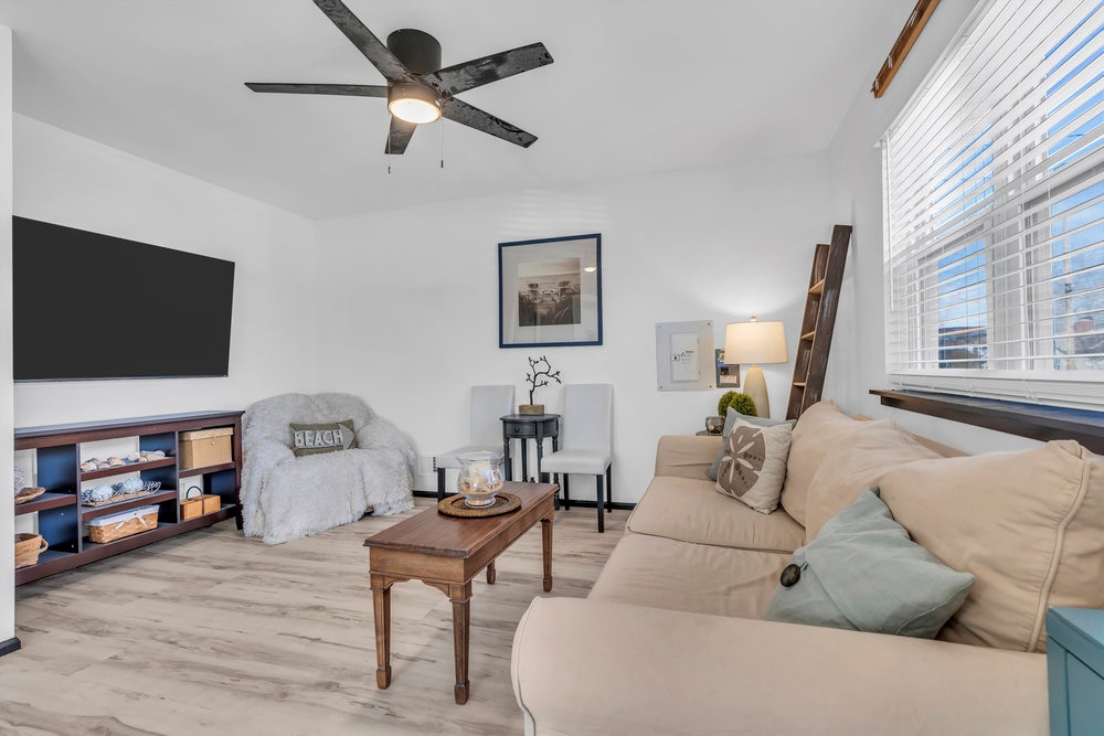Each bedroom is equipped with a dresser, ceiling fan, window ac unit, Smart TV, luggage rack, clothes hamper, hangers, extra linens, blankets and pillows.