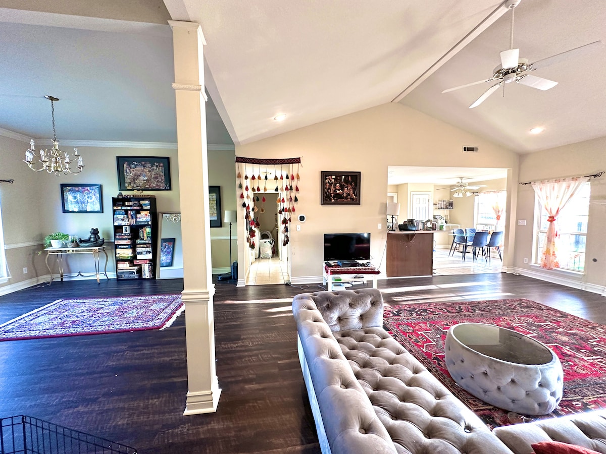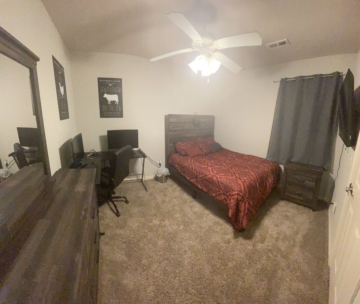 Simple and convenient home in a peaceful neighborhood, centrally-located close to trails, art, food, and business. The Kessler room is one of two guest rooms in the household with access to a full bath via a hallway. The room itself is equipped with one closet, tv, and bed. Kitchen, utility, dining and living rooms are shared.