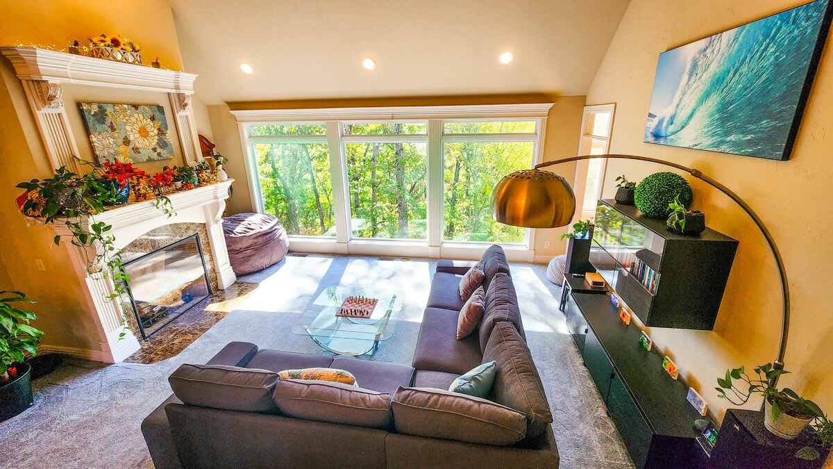 Bunk bed room with a private bathroom attached to room in an amazing house with amazing forest views.