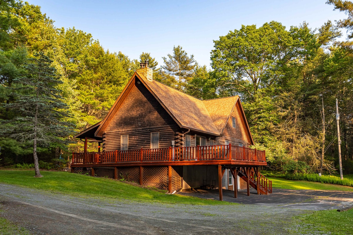 The perfect getaway for a small family or 1-2 couples set on a quiet country (dead end) road. Three bed, one bath authentic log cabin set on nearly seven wooded acres, with community access to a beautiful pond for fishing or boating within walking distance. A serene setting yet close to town and the Delaware River for activities.