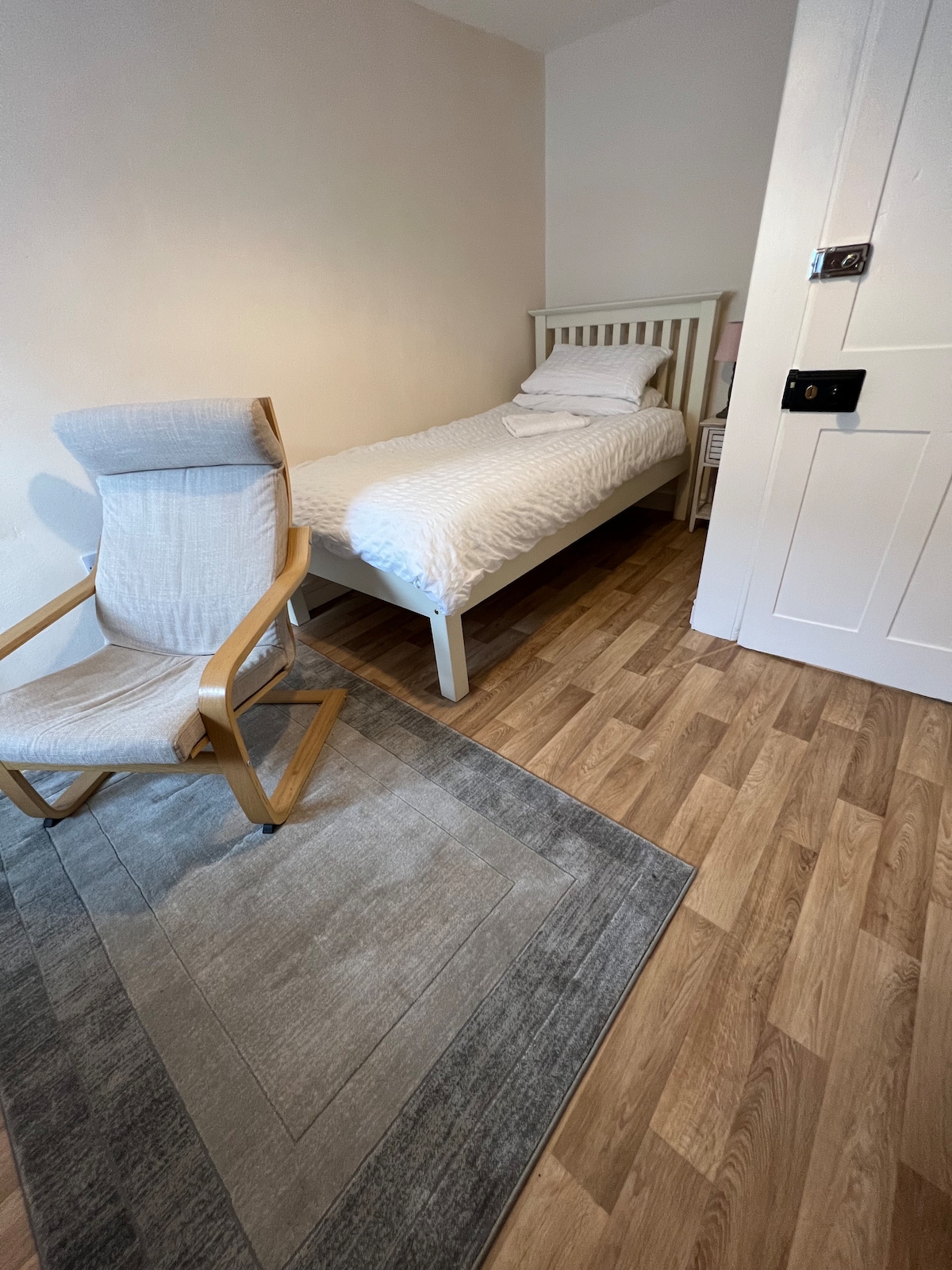There is a comfy single bed with high quality linen, cupboard with hanging space and shelves, bedside table, radio and stool. A refreshment tray including selection of teas, filter coffee, and complimentary biscuits. We supply fresh milk.