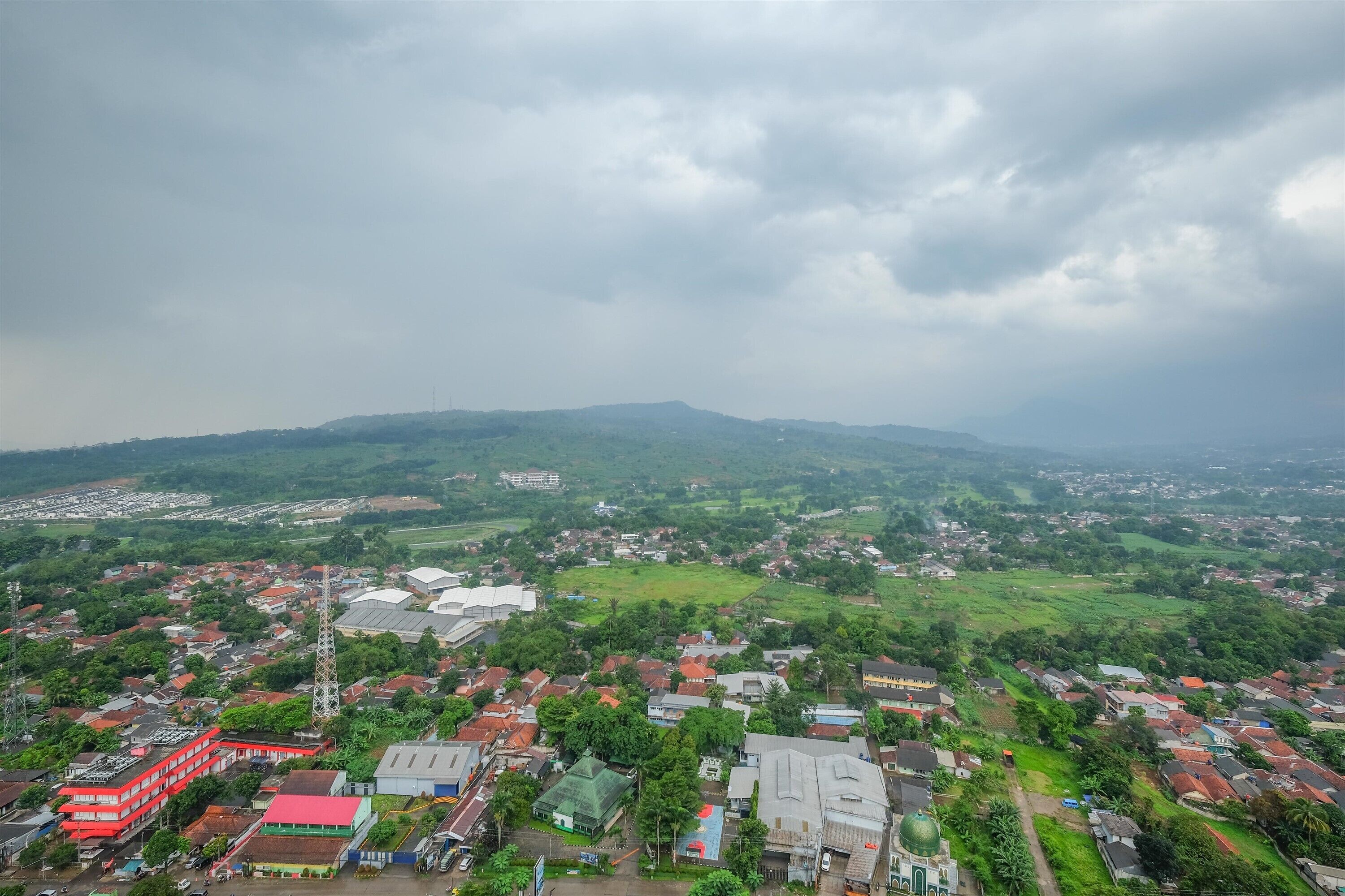 Your cozy studio bedroom is on the second floor, facing views of some farms and Gunung Salak in the background.