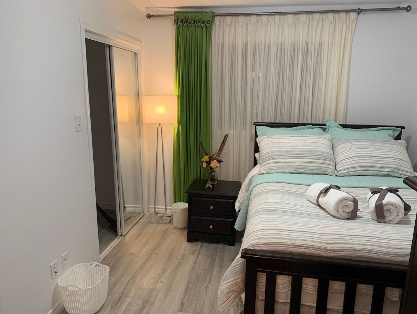 This basement suite has one bedroom and a second queen bed in the living room area. There is a set of french doors that separates the sleeping area for privacy or can be left open, for your preference.