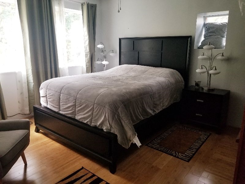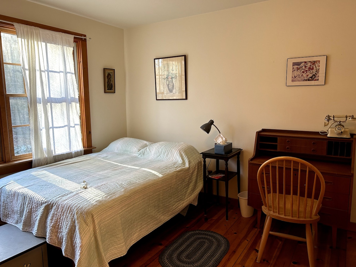 The bedroom is located on the second level, completely private from the rest of the house. Warm, comfortable, light and spacious, internet, smart TV, an amazing bed, soft, high-count linens and goose down duvet, a comfortable chair and a large chest of drawers for your belongings. This bedroom is an en-suite, with a recently renovated shower for your enjoyment.