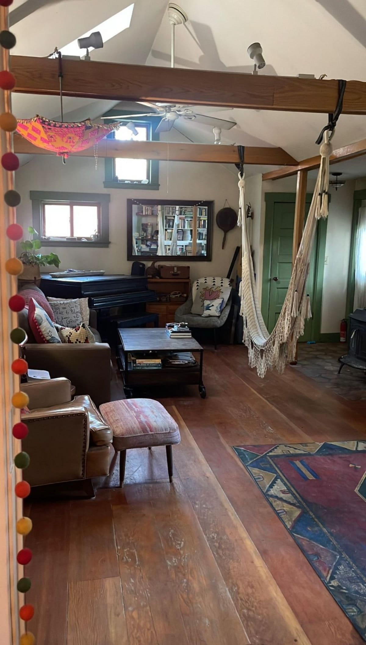 This spacious studio apartment is located in the former Swedish Congregational Church in historic Swedeville, a secluded hilly neighborhood built by Swedish immigrants in the 1800's. For years it housed Rick and Liza’s stained glass studio, which they have now lovingly and creatively transformed into a residence.
