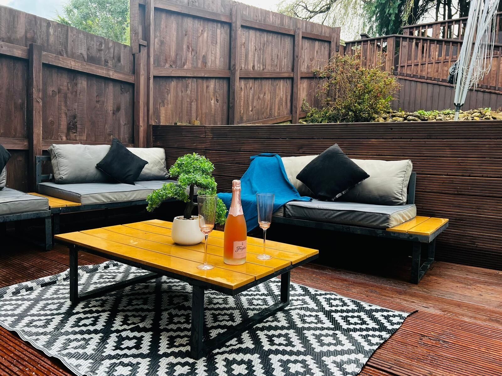 Enclosed out door decking area ideal for alfresco dining and a log burning hot tub.