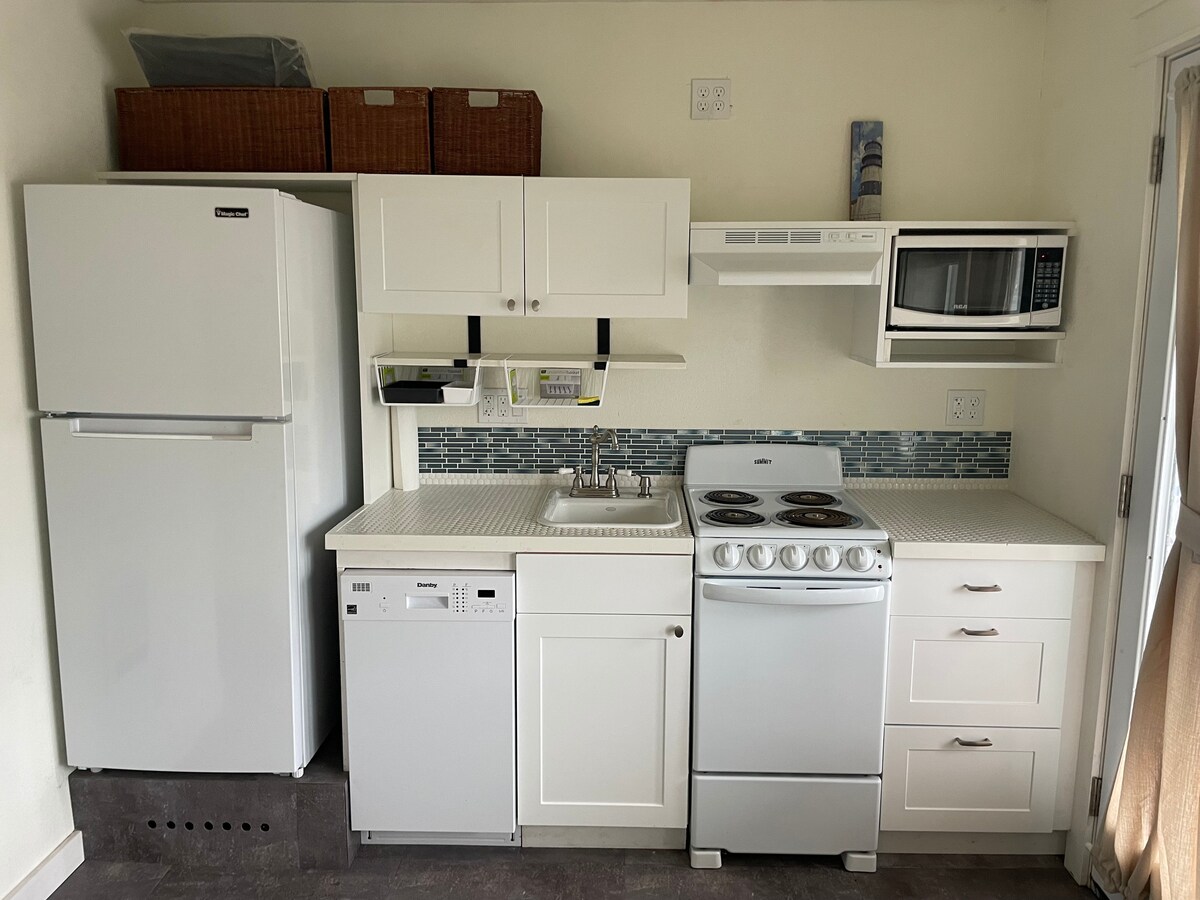 Lovely space for one or two, with queen bed, comfortable chairs, desk,, large television and nicely equipped kitchenette. Views of the ocean from deck, away from the fog. Beautiful bathroom with large jacuzzi tub and separate shower. Spa-like living.