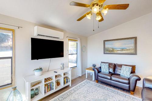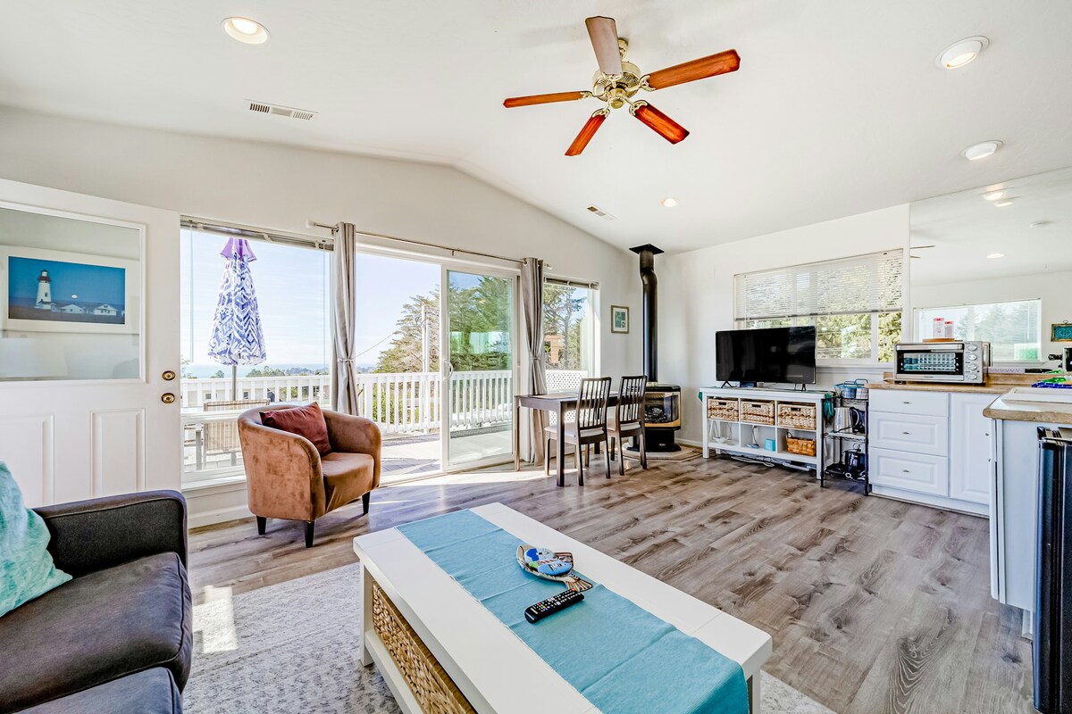 Find yourself perched mere minutes from downtown and the beach when you make this perfect retreat home base! As soon as you arrive, the spacious deck will be calling your name with ample seating and gorgeous views of the harbor and ocean, so bring a cocktail out in the fresh air and slip into relaxation mode. Not to mention, the sunsets never cease to amaze guests every night! Inside, you will find a wonderful open layout that will be perfect for entertaining. The kitchenette is complete with a mini-fridge, microwave, and more when you need to whip up snacks, and the adorable dining area will be perfect for a game night. If you are looking to settle down a bit, the flatscreen TV and plush sofa are the best combination for chilling out as you watch a favorite movie. What are you waiting for? The Oregon Coast is calling your name!