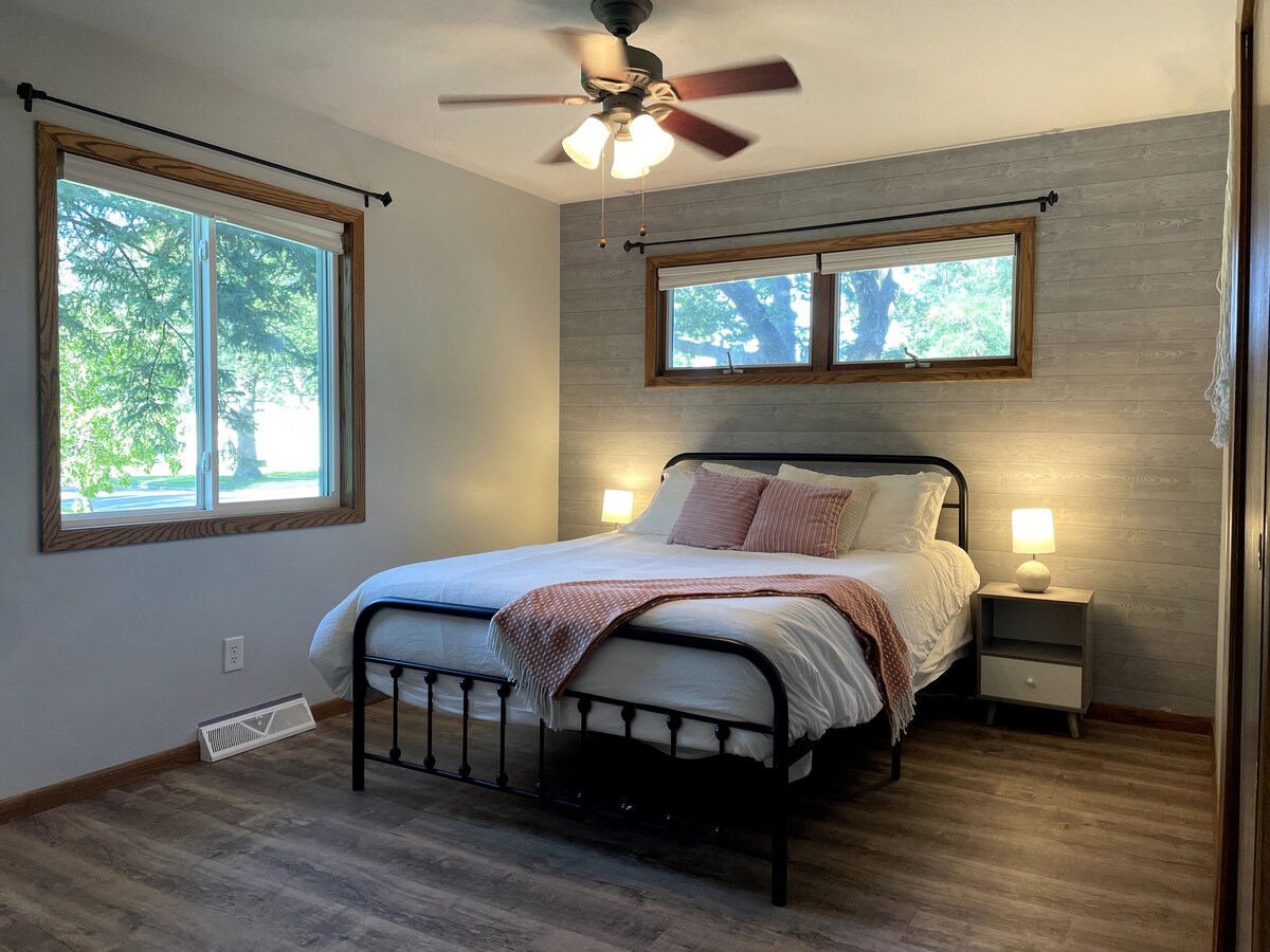 The premier room features a comfortable queen-sized bed, offering a cozy retreat in our charming house. Nestled in Brookings, SD and 1 mile off of I-29, this suburban setting provides both serenity and easy access. Enjoy the perks of very fast Wi-Fi and a convenient location during your entire stay.