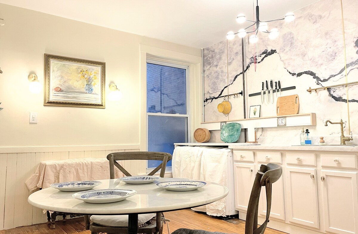 Shared spaces include a modern full kitchen with new induction stovetop, marble table, and butler's pantry. Original antique clawfoot tub in shared bathroom.