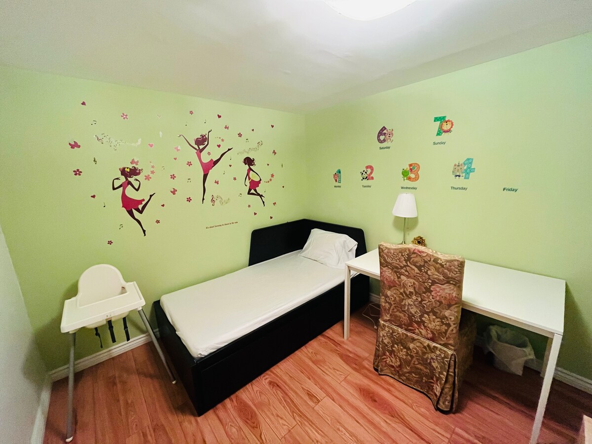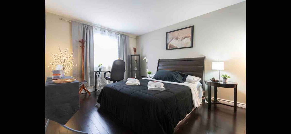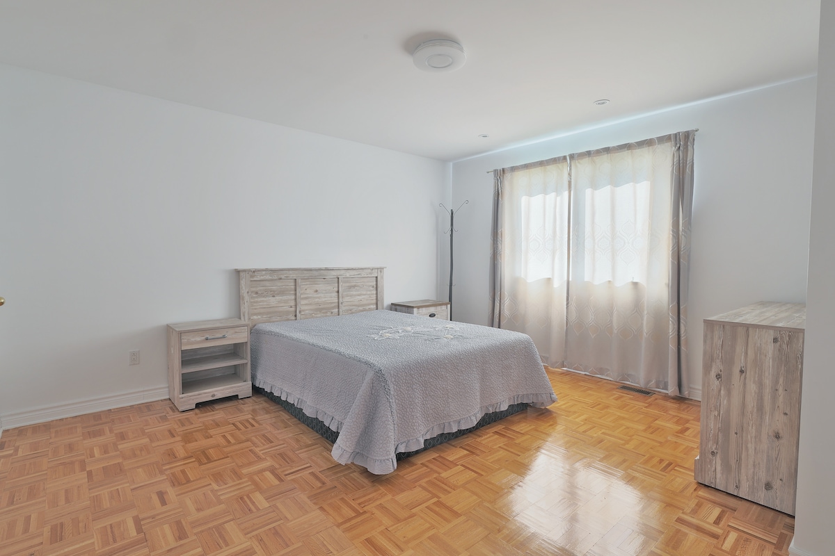 Spacious bedroom with a new queen bed and mattress,Convenient for a single traveller or a couple or two friends that don’t mind sharing a bed . The bedroom looks out onto the quite suburban street and nice houses . Slight sounds from the highway to help you sleep better. You can book this room for one person or 2 it’s also a safe space for LGBTQ