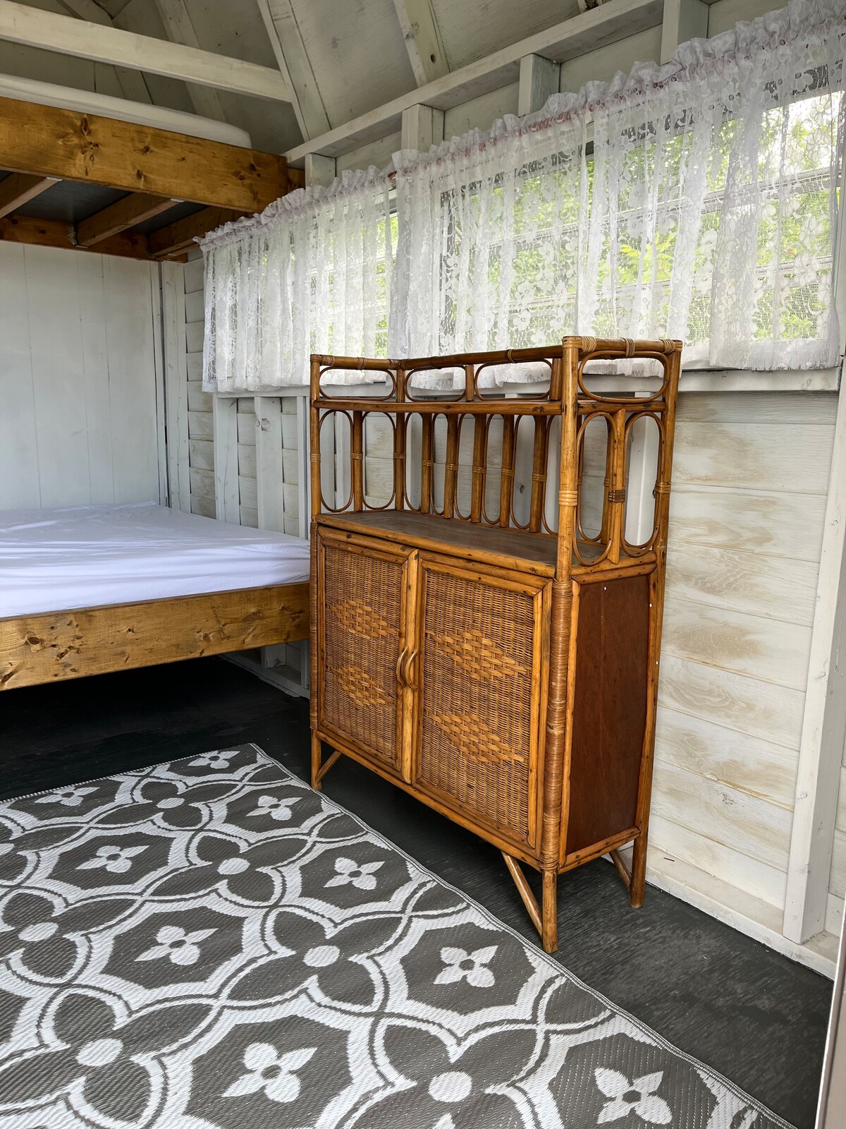 12 x8 bunkie with wooden deck to enjoy your morning coffee and listen to the birds. Beds include a double and twin with 6 inch gel/foam mattress. Twin mattress is on top bunk requiring to climb a ladder for access. Clean fitted sheets are included.