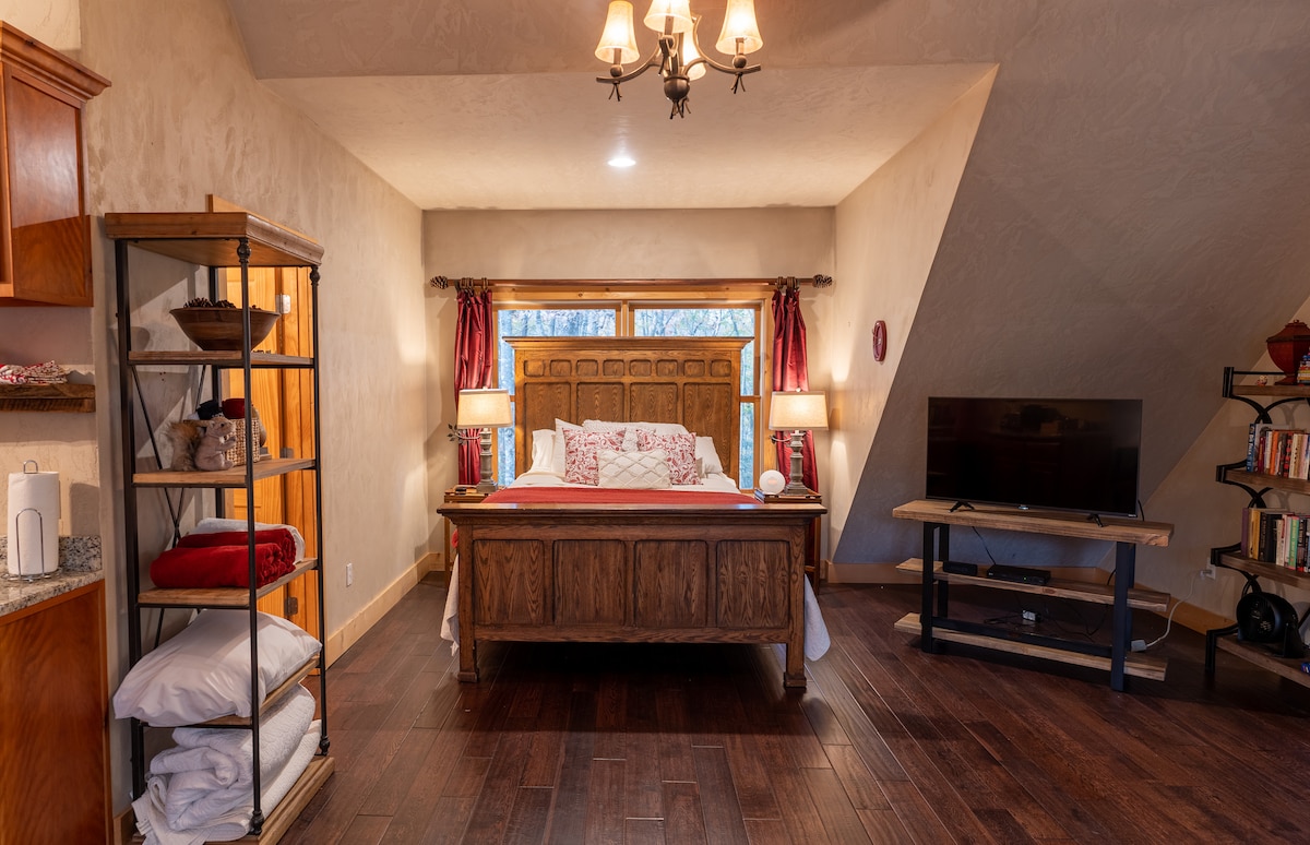 • Main Level Bedroom has a King bed, full bath and a TV.