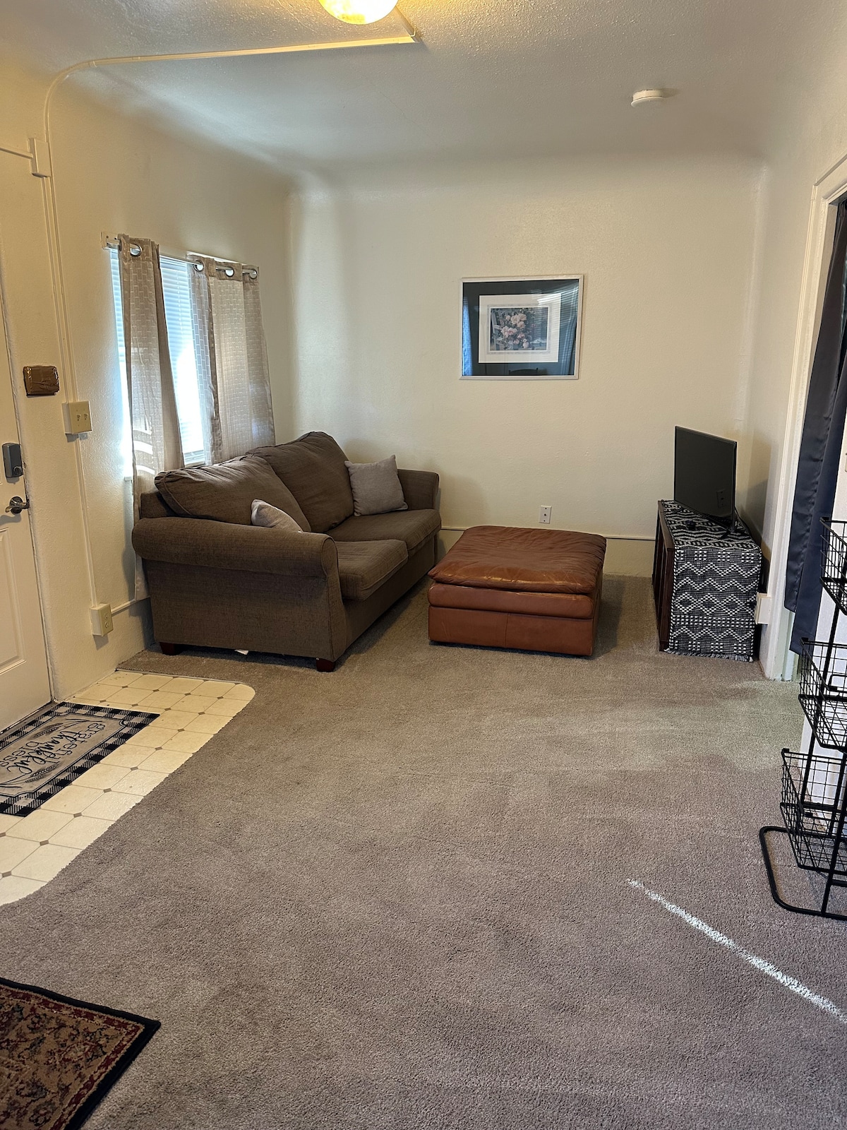 This space is separate from the main home and requires a walk through the backyard to get to the main home to access the shared bathroom. The floor in this space is concrete and the walls are unpainted stucco. No television, air conditioning, attached bath, or black-out curtains. Please view photos closely and ask any questions! Thanks!