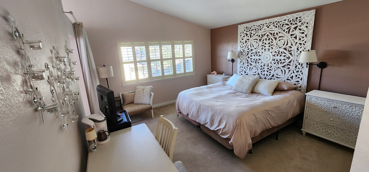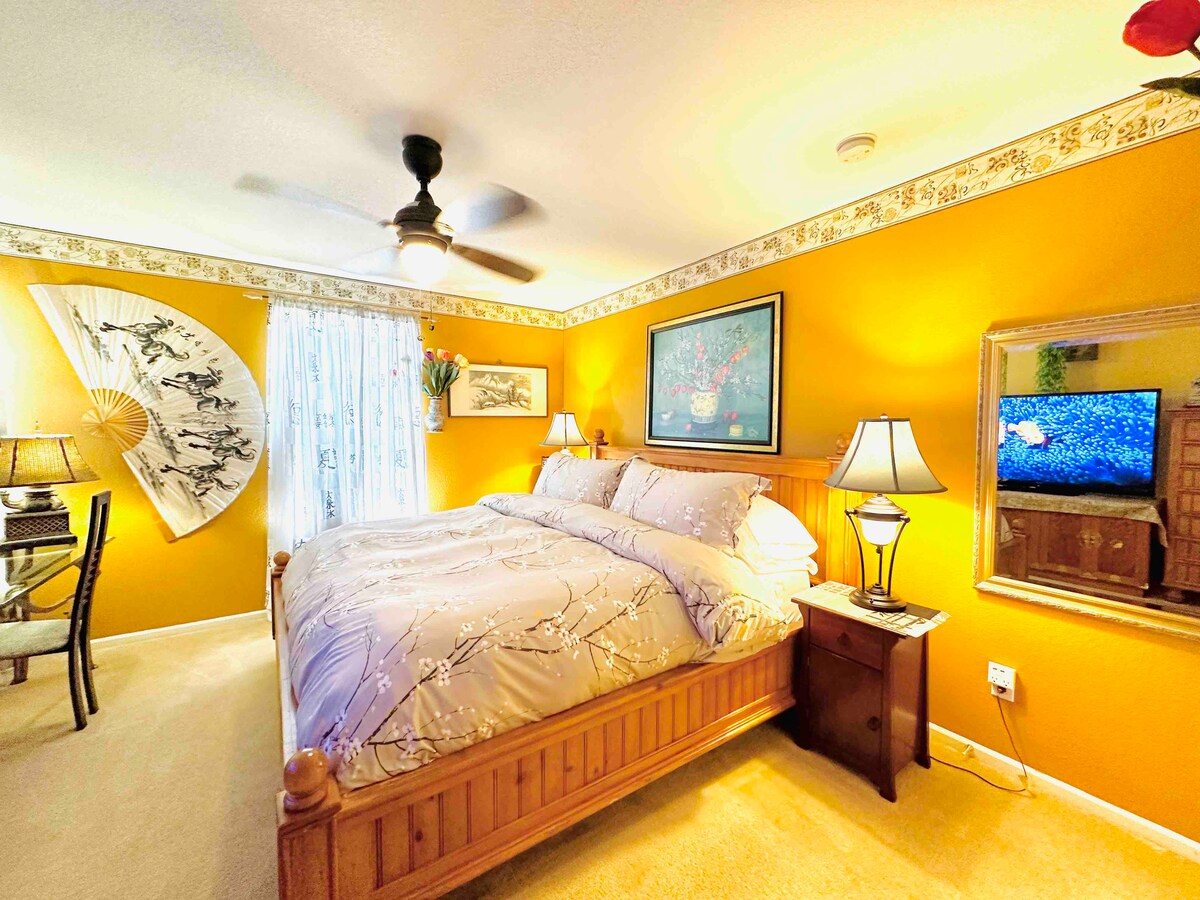 Relax in luxury and comfort of a King size bed padded with memory foam and covered in high quality bedsheets woven from premium 850 thread count of 100% Egyptian cotton and real down comforter! The sumptuous bed has plenty of pillows and soft comforter(s). The headboard has usb ports outlets, 2 ports on each side for your convenience. And more clean pillows and blankets are provided, all stored in your closet for your convenience. This lavish Ensuite has plenty of clothes storage, with lots of hangers in the closet. There's also a laptop table and a 3.2 cu. ft. Mini Fridge for your foods and drinks. The room also boasts a 61-inch HDTV with access to 4K Chromecast. For your convenience a large programmable coffee maker is available in your room.