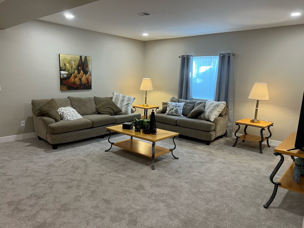 Brand new 2023 basement includes a spacious living room with family sofa, tv and entertainment items, kitchen with a refrigerator, dishwasher, microwave, cooktop, coffee maker, fully stocked cabinets for cooking.