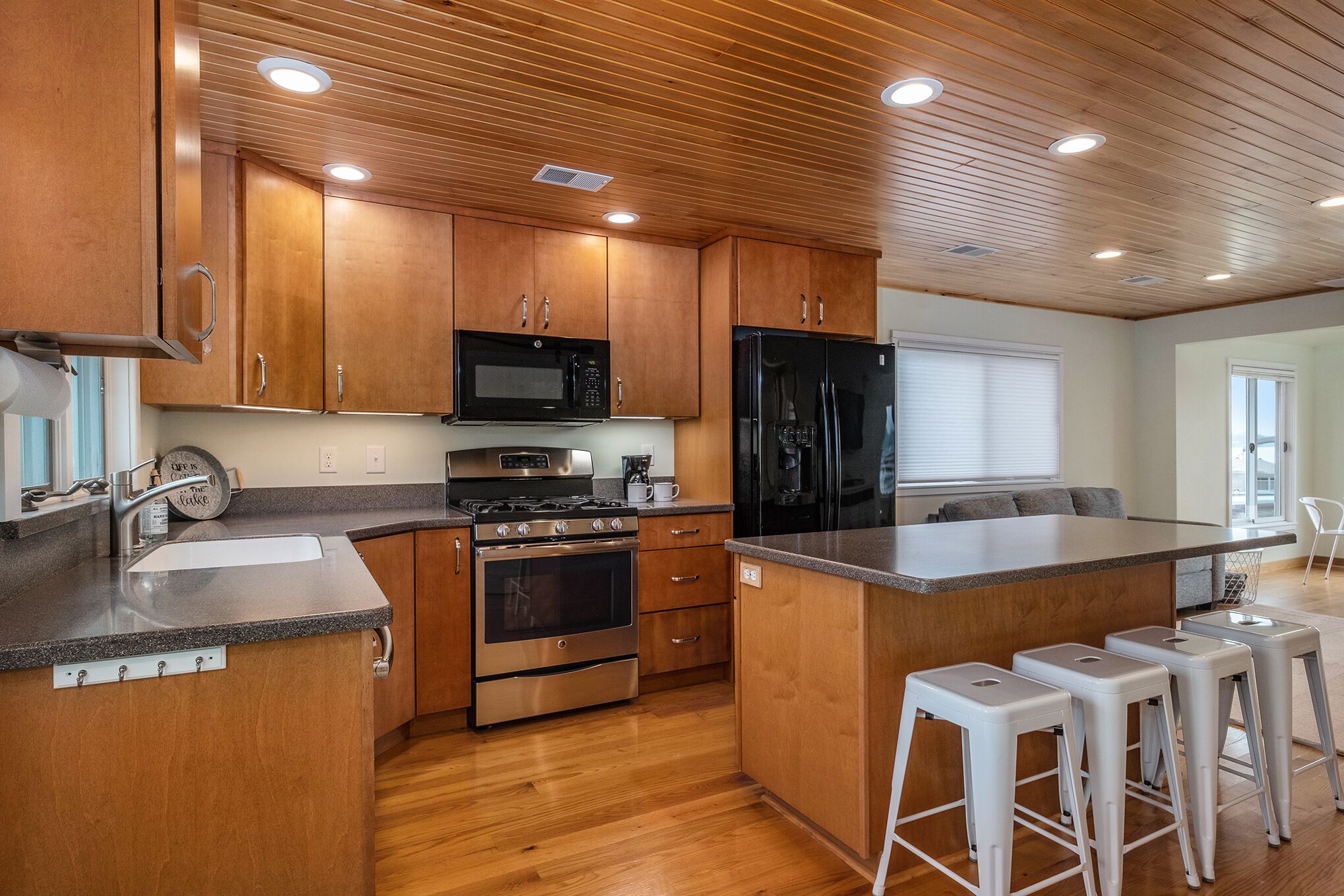 The kitchen has a french door refrigerator, gas stove/oven, microwave, dishwasher, toaster, coffee maker, cooking utensils, silverware, plates, cups, bowls, and all the items you need to cook a memorable meal. The kitchen island is large and has room to seat 4 comfortably. A grill is located on the patio facing the lake that can be used for cooking (grilling utensils are in the kitchen).