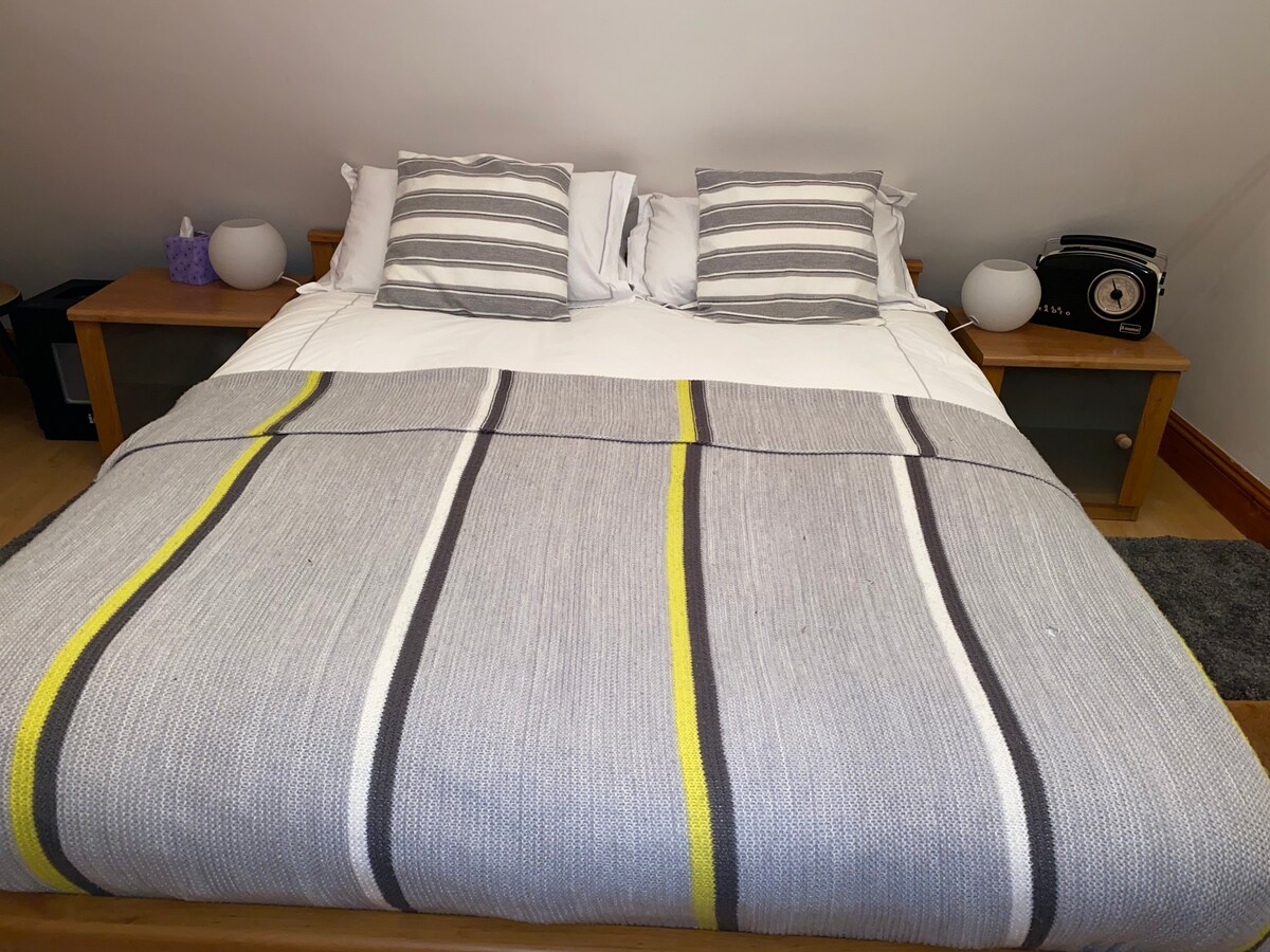 There is one really comfortable double bed Own kitchenette which has a 2 ring hob, toaster, kettle, microwave etc. Fully equipped with cutlery and crockery. Fire extinguisher and fire blanket for your safety plus first aid kit is supplied. Heating is off in the summer months. We are trialling a folding table in the room. I personally think it takes up too much space but guests seem to love it. If you don’t want it in the room I can always remove it.