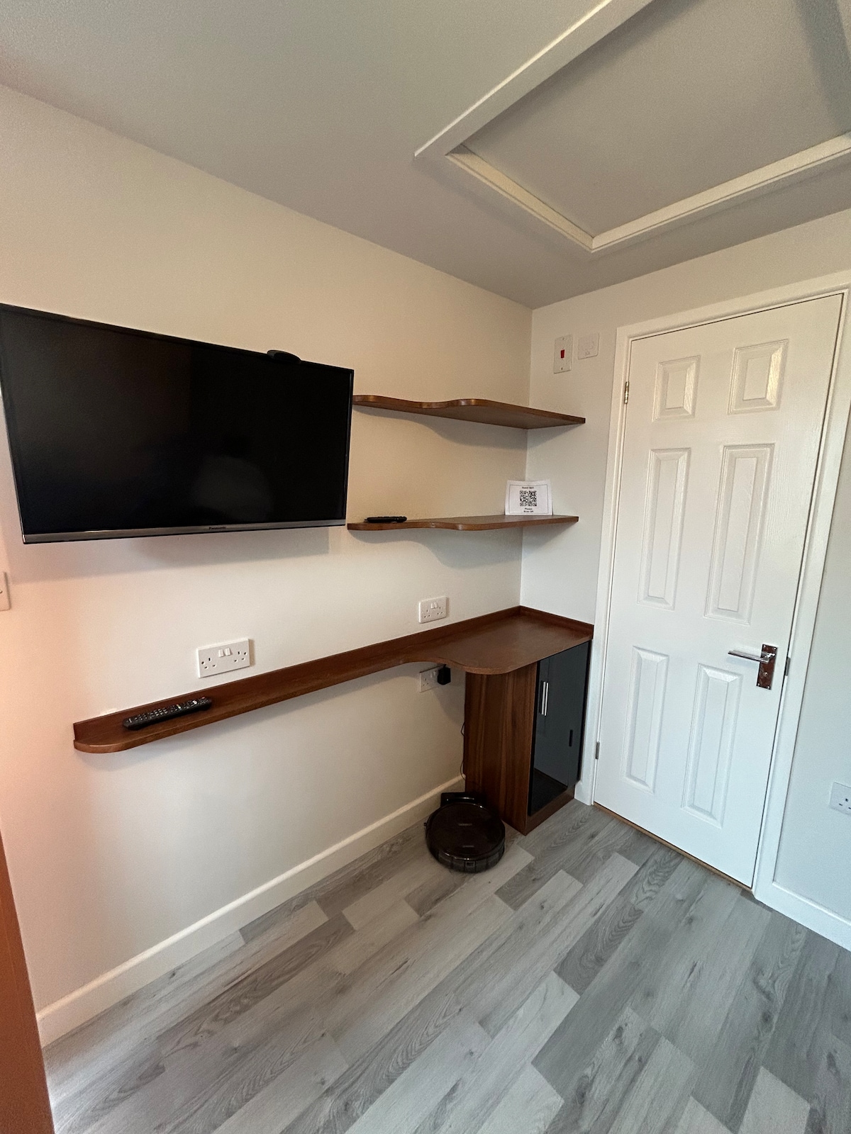 There's a TV with a fire stick, with Netflix, Disney + and Amazon Prime.