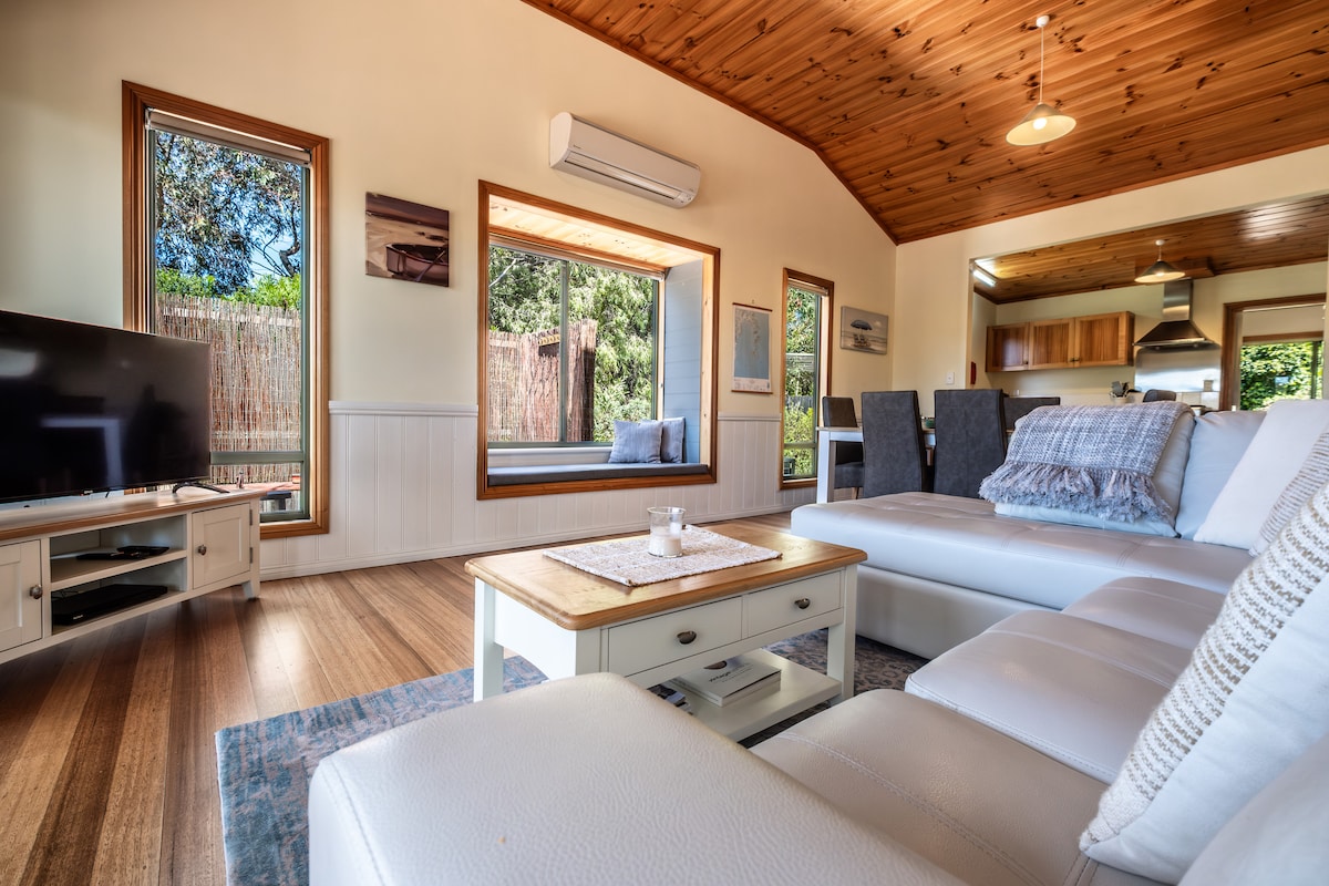 The living area has reverse cycle air conditioning for heating and cooling, flat screen T.V. couches, dining table and chairs.