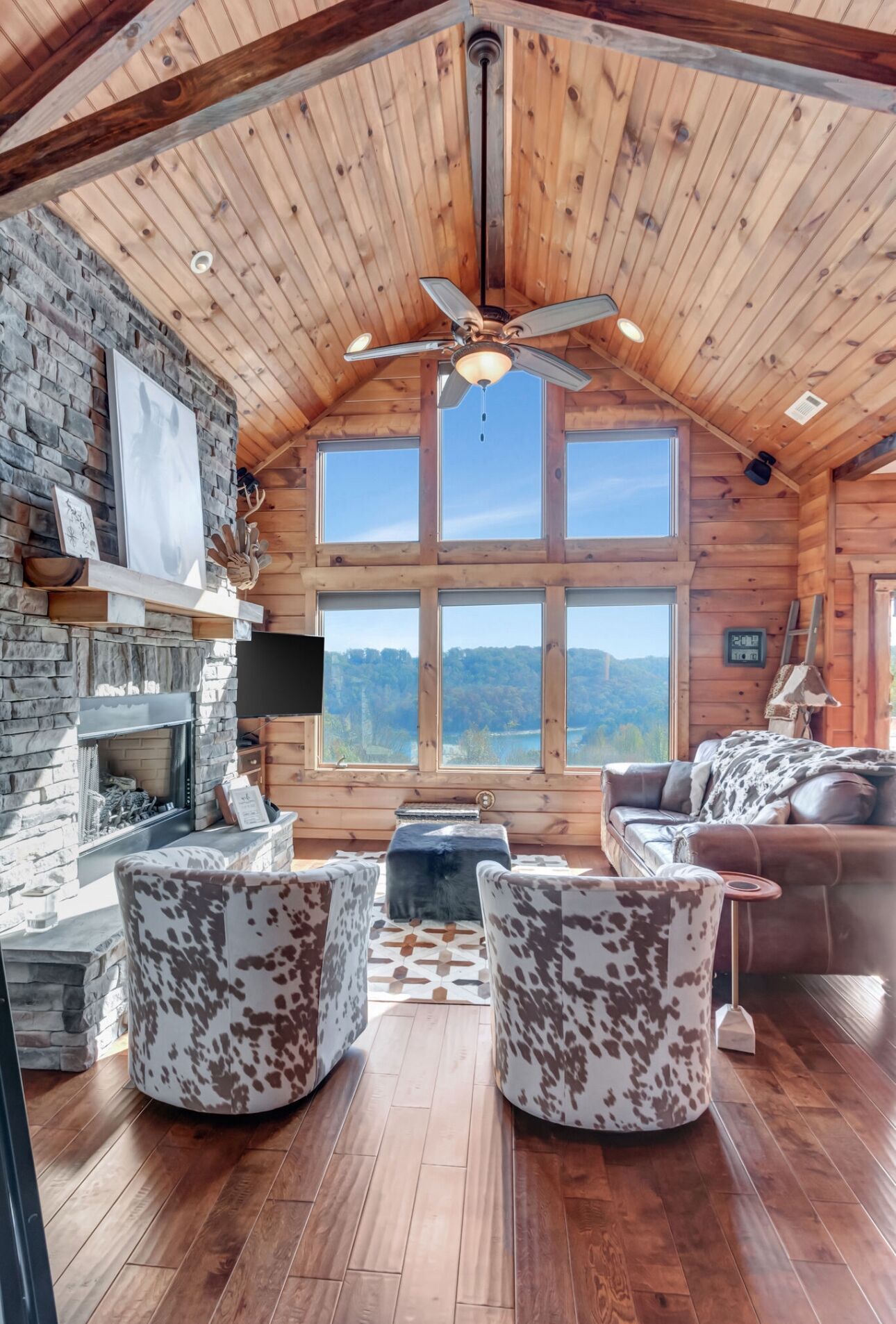 The heart of the home boasts a bright, open floor plan with beautiful décor that blends modern touches with the warmth of cabin life. The fully equipped kitchen makes it easy to prepare meals, while the living area is perfect for relaxing after a day of outdoor fun.