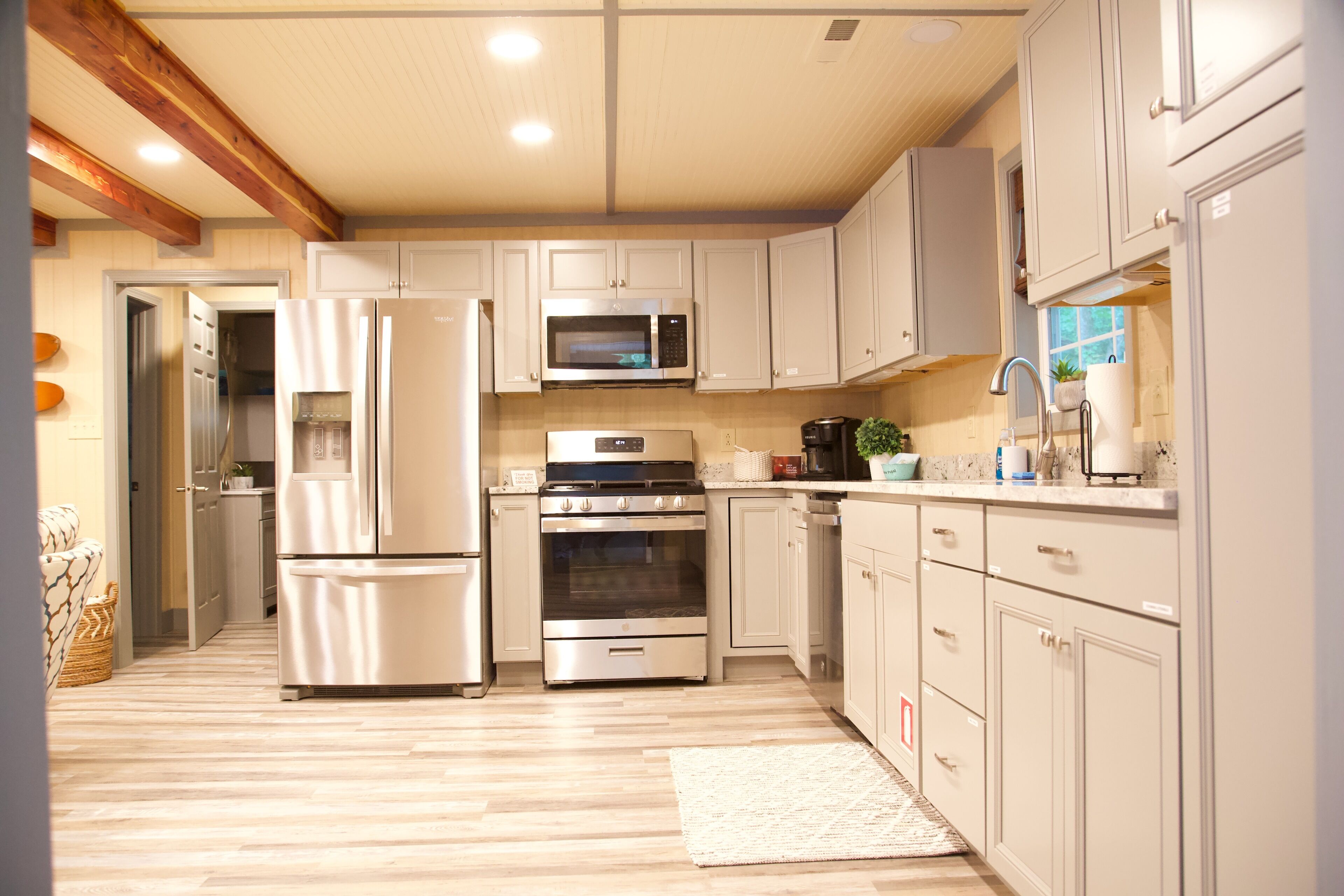 The main living area has the kitchen, bathroom, livingroom, and the second floor deck with a charcoal grill if you are in the mood to cook out.