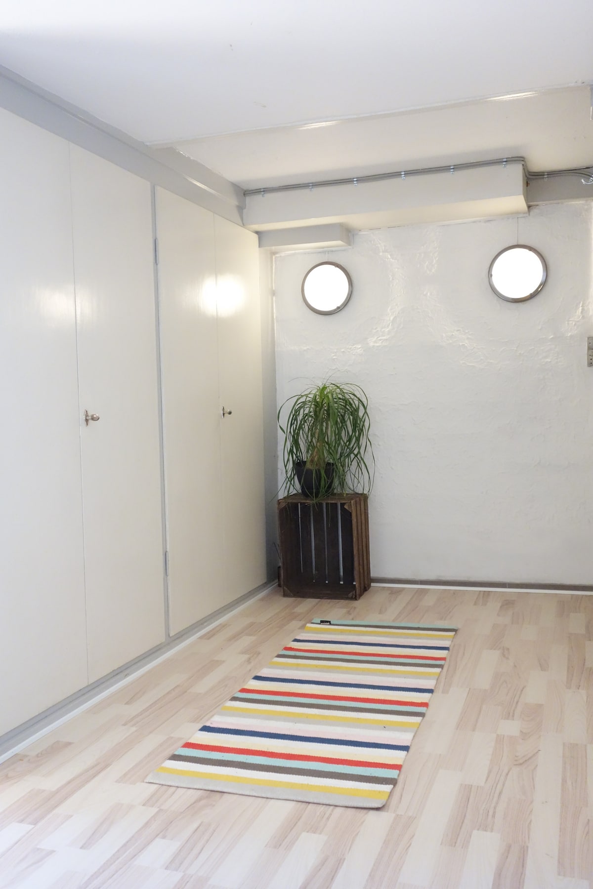 The room is located by the end of the lower part of a three level old house hidden behind the normal classic buildings. On the first floor there are creative studios and on third we have a famous disc-gulf player living with his family. Very sweet and open to a quick little chat in the courtyard.
