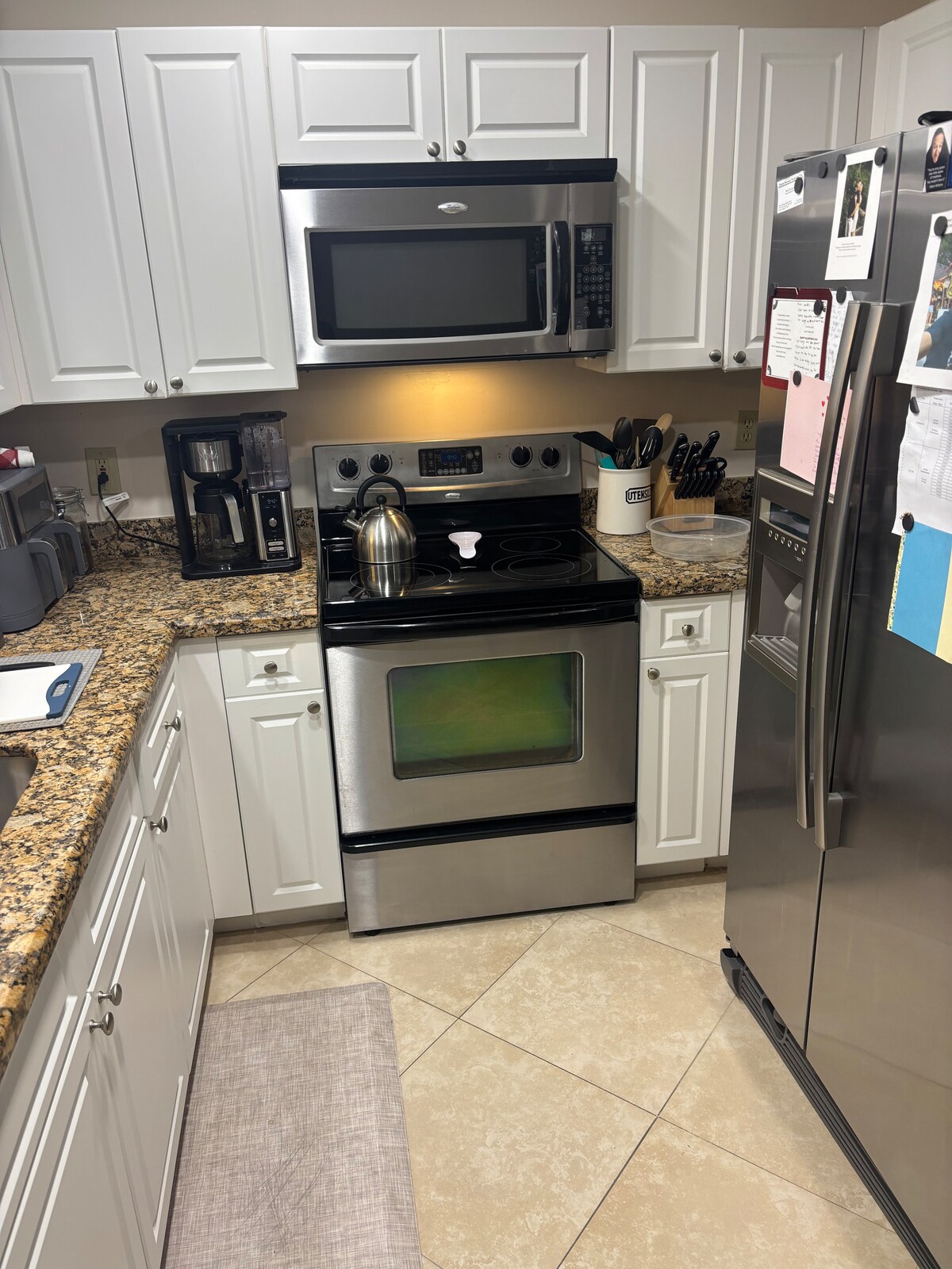 The gourmet kitchen is fully equipped with built-in oven and microwave, an electric smooth-top style cooktop with hot surface indicator, a dishwasher and french door refrigerator with ice maker. Plenty of small appliances including a Keurig and a regular coffee makers.