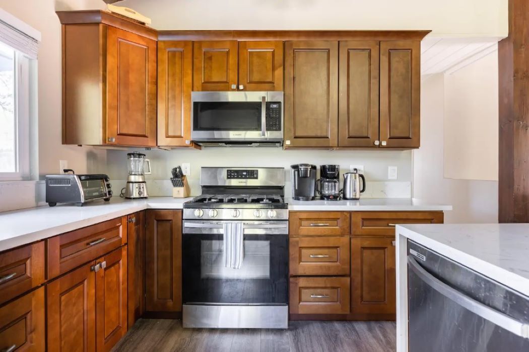 • Open Floor Plan Kitchen : Full-sized stove, fridge, microwave, and dishwasher, perfect for cooking. Includes Keurig coffee maker, drip coffee maker, kettle, toaster, blender, crockpot, rice cooker, waffle maker, and hand mixer.
