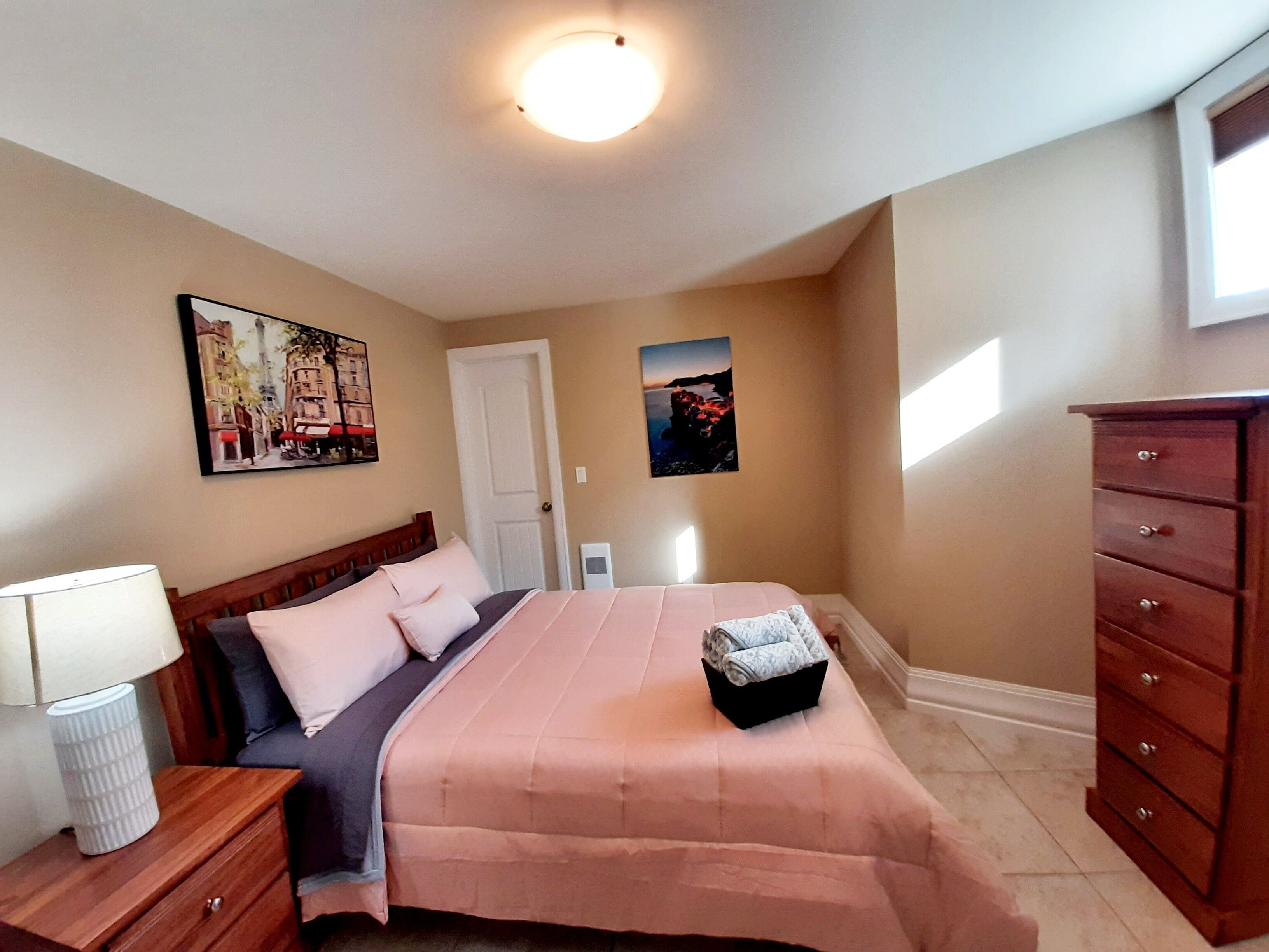 This suite is a secure and comfortable walkout basement suite with a separate entrance, roughly 600 SQ FT. This is a private space that only you will have access to. In the bedroom you will find a comfortable queen sized bed, and an attached bathroom with a shower.