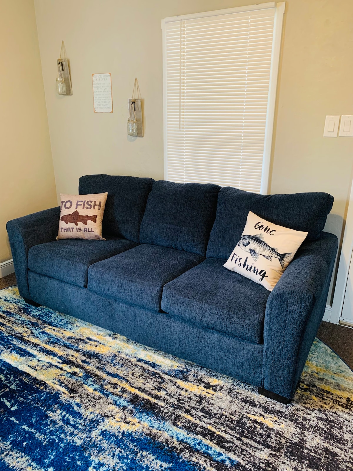 Queen memory foam bed, roomy open concept, electric fireplace, leather sofa, 2 accent chairs, HD TV with Roku, full kitchen, tile bathroom, large deck with seating and firepit, small bbq, vaulted ceiling, washer dryer in unit, towels, hair and body products, coffee and tea, a French press (and a drip maker if you must), heat and A/C, games, cocktail maker set, wine, champagne, cocktail glasses, and more.