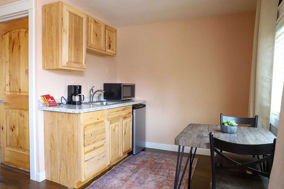 The Pheasant at 25 E Bannack Apartment #1 is the perfect home base for your trip to Dillon, Montana. Nestled in the heart of the city, this second story, historic property offers a cozy and charming atmosphere that will make guests feel right at home. The bedroom features a comfortable king bed, ensuring a restful night's sleep after a day of exploring. With amenities like WiFi, a fully appointed kitchen, and 75” Roku TV, all your needs are taken care of. The bathroom, just off the master, is equipped with a hair dryer and a bathtub for ultimate relaxation. Additionally, the living room offers an additional sleeping space with its queen sized leather sleeper sofa. We look forward to hosting you at our place. While the hustle and bustle of town does provide for excitement, please understand that we cannot control the events that happen in town, noise from neighboring businesses, or citizens walking the streets. With this in mind, we installed top of the line windows to block out city noises, offer Bluetooth speakers to enjoy your favorite tunes, fans (because who doesn’t enjoy white noise at night), and earplugs (in the night stand just in case).