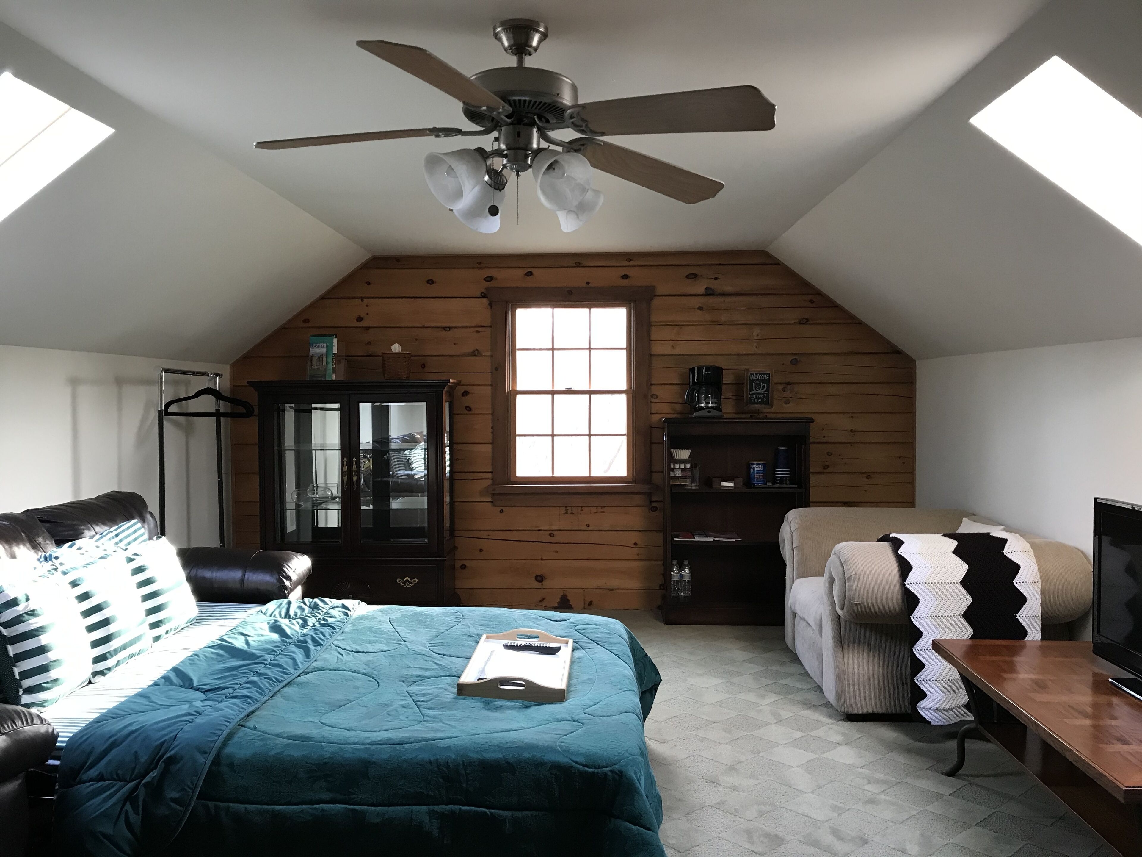 Guest accommodations are the Mildred Manning room, a large light-filled bedroom with king size bed, dresser, desk, mini-fridge/freezer with ice, a Keurig machine and a closet with hangers. The original wavy glass windows are operable to let in fresh air and include shades and curtains. The bedroom is heated and cooled with central heat/air and the ducts were just cleaned.