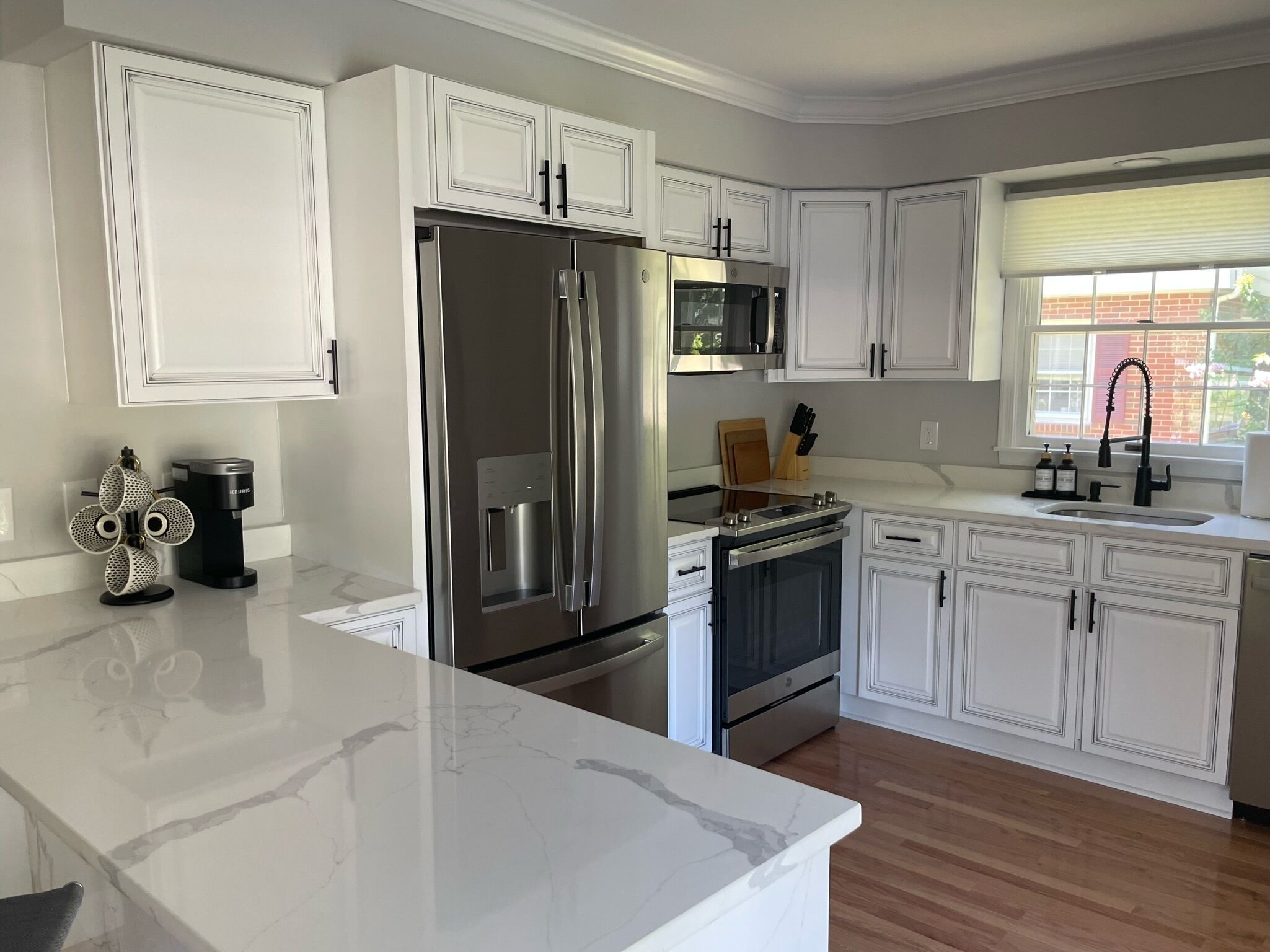 The Kitchen: The kitchen boasts a sleek all-white design, complete with upgraded appliances, including a double oven and a wine refrigerator.