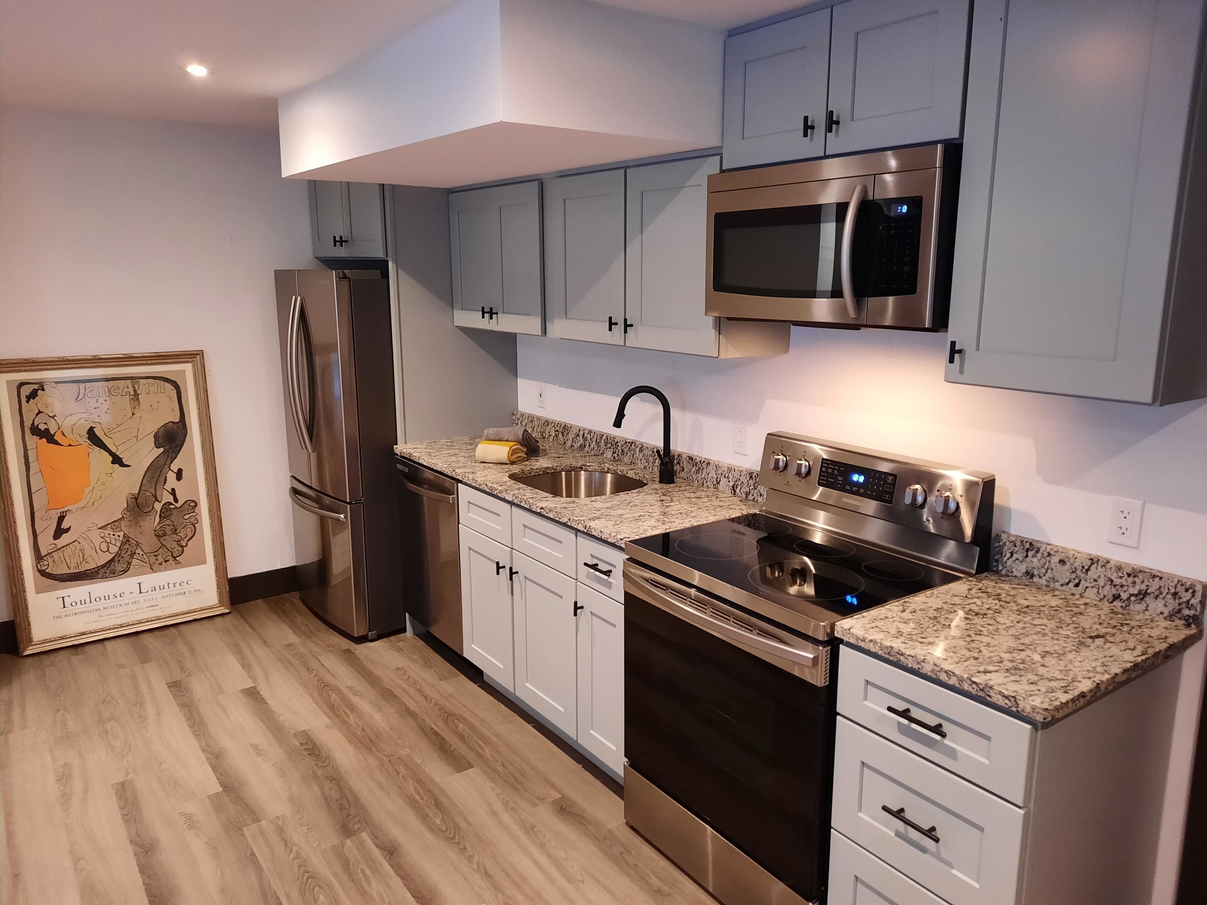 d/w, granite counters.. New bathroom with large shower. Bedroom with queen bed and chaise lounge Suitable to sleep 2 adults and child. Not ideal for more than 3.