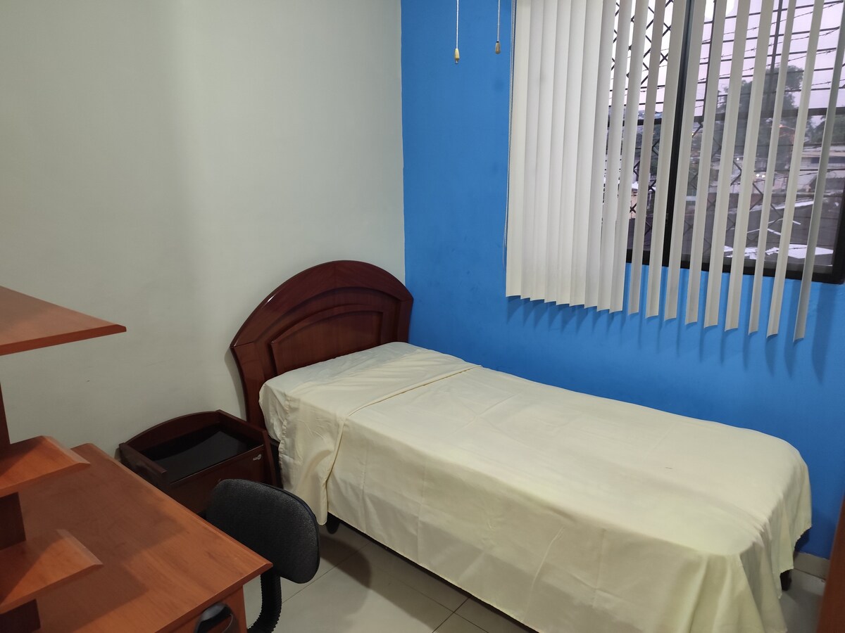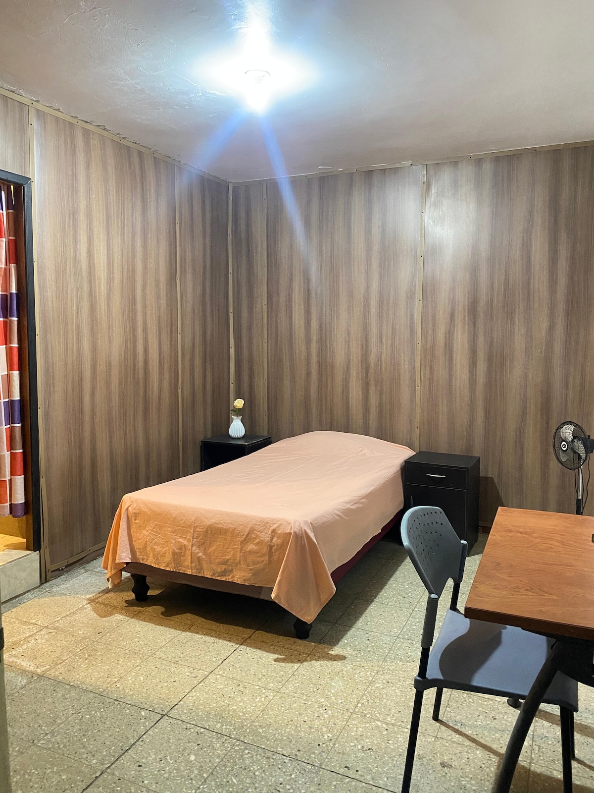 Small room with private bathroom, window on the street It has a tumbado fan. Located in a residence in a very safe middle class citadel called Miraflores.
