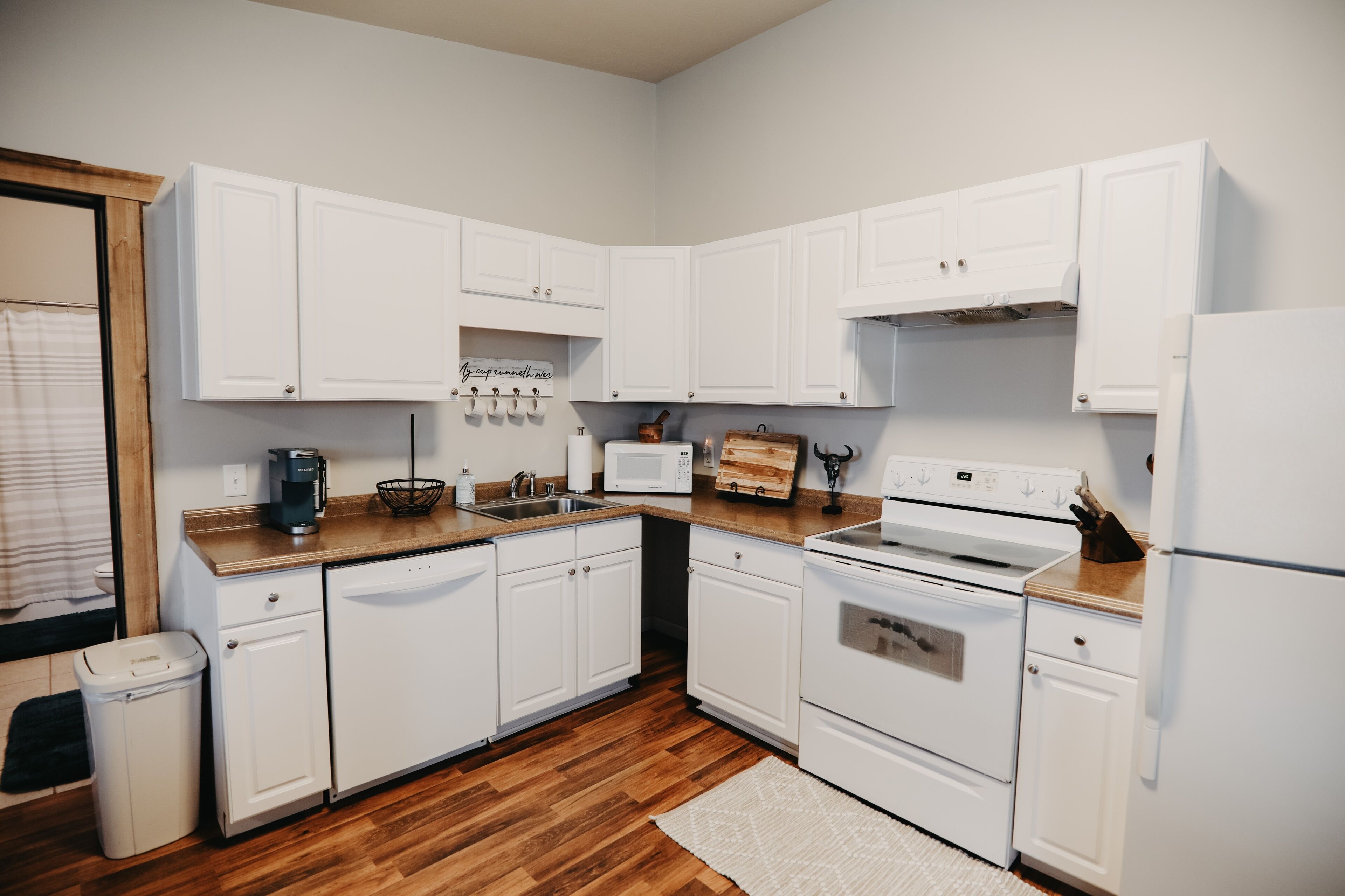 The kitchen has all new appliances and is fully equipped for your culinary needs. The home has four exterior doors for easy access and is handicap accessible as well. The home also has full sized Speed Queen Washer and Dryer.