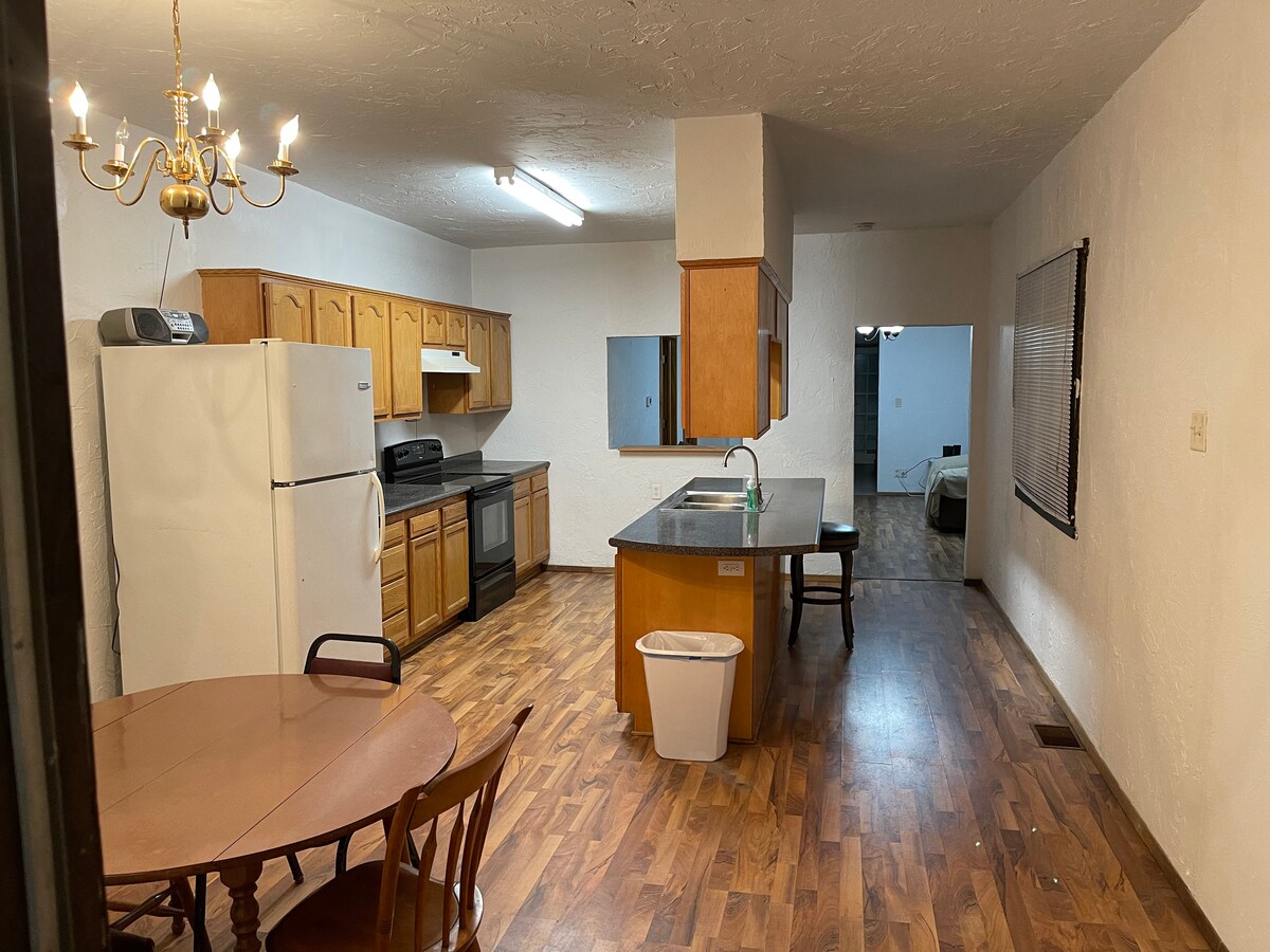 All units have full baths with tub/shower combo. Each unit has a kitchen or kitchenette with eat-in table space. Units are equipped with most everything that we can think of to make your stay as comfortable as possible. There is a self-pay washer and dryer on the premises. Ample parking lot.