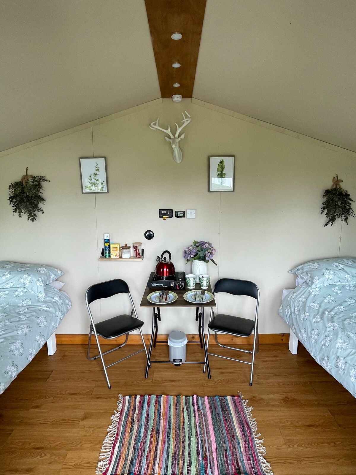 The Hut includes all the mod-cons you could want- a king size bed, full electricity and wifi, smart TV, large hot shower, and small kitchen.. whilst also making you feel as though you are camping!