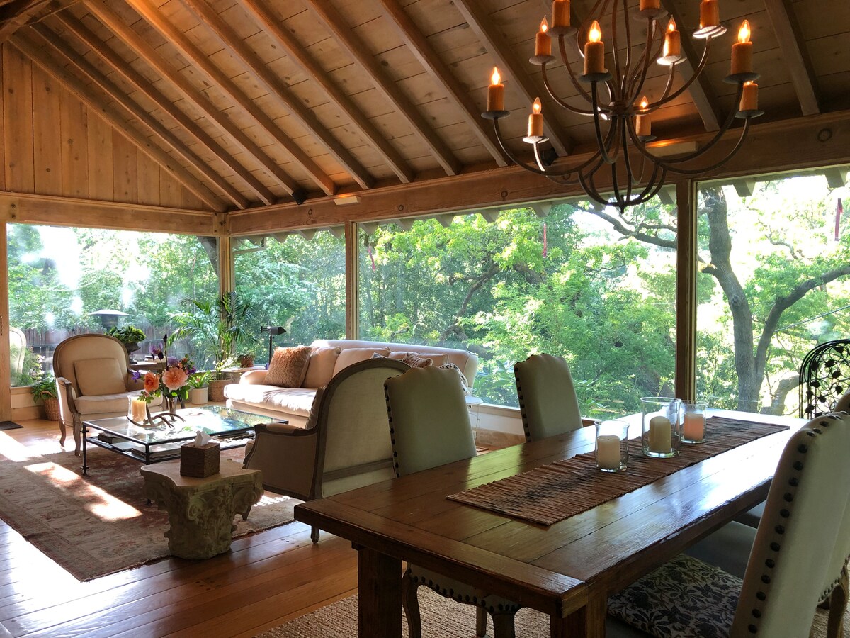 Tucked between San Anselmo & Fairfax, this private 3BR retreat offers stunning treetop views, a full kitchen, rooftop deck, and a bonus artist studio—perfect for remote work or creative flow. Walk to cafes, trails, shops, and award-winning dining, or relax on the spacious deck surrounded by redwoods. Fast Wi-Fi, peaceful vibes, and all the comforts of home make this a perfect escape for couples, families, or solo travelers seeking nature and convenience.