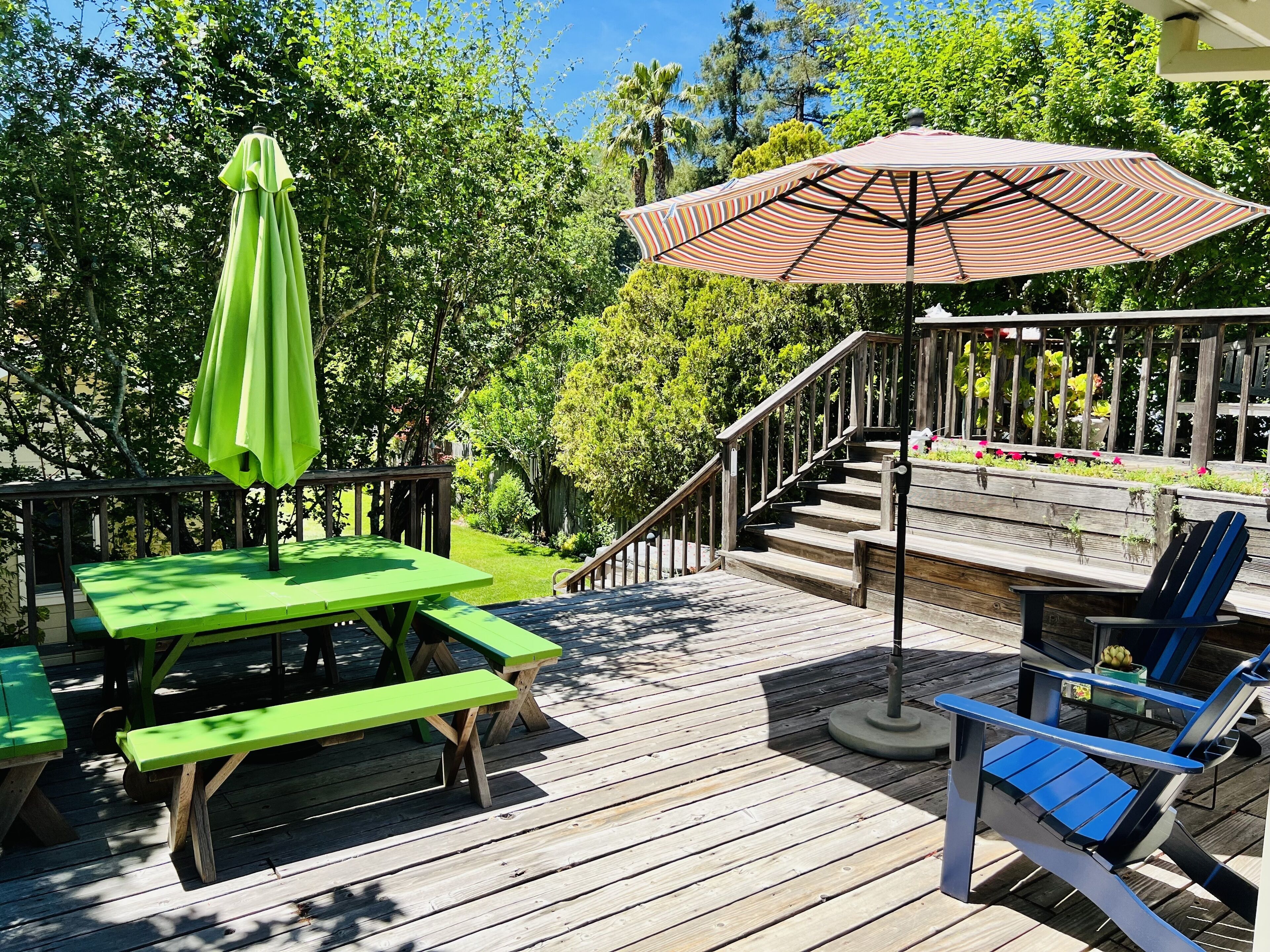 With massive deck space, gardens and a hot tub with a view... You won't need to leave the property to experience the best of Marin county. High speed wifi, central heating. Plenty of on site parking which can be hard to find in Fairfax.