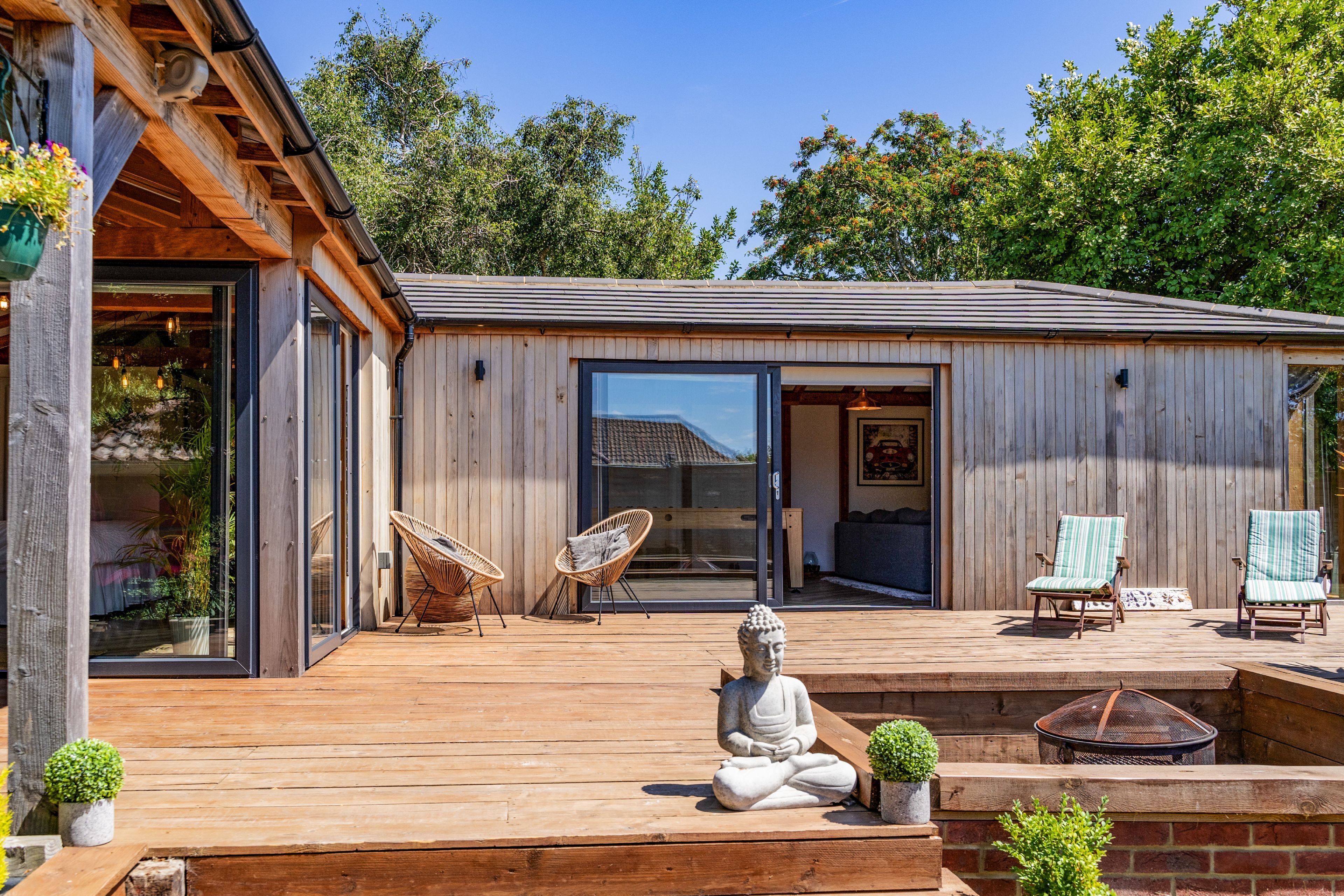 The Cabin is a wonderful, open plan, green oak timber framed studio apartment nestled within neatly landscaped gardens in the residential village of Hill Head, Fareham.