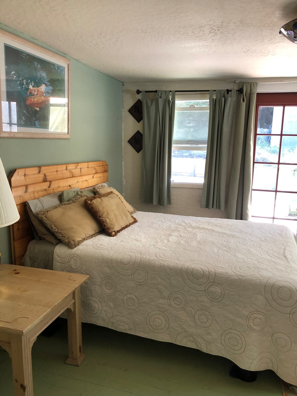The Evergreen Room - Queen size velvet bed located on the lower level with the closest access to the hot tub and gameroom.